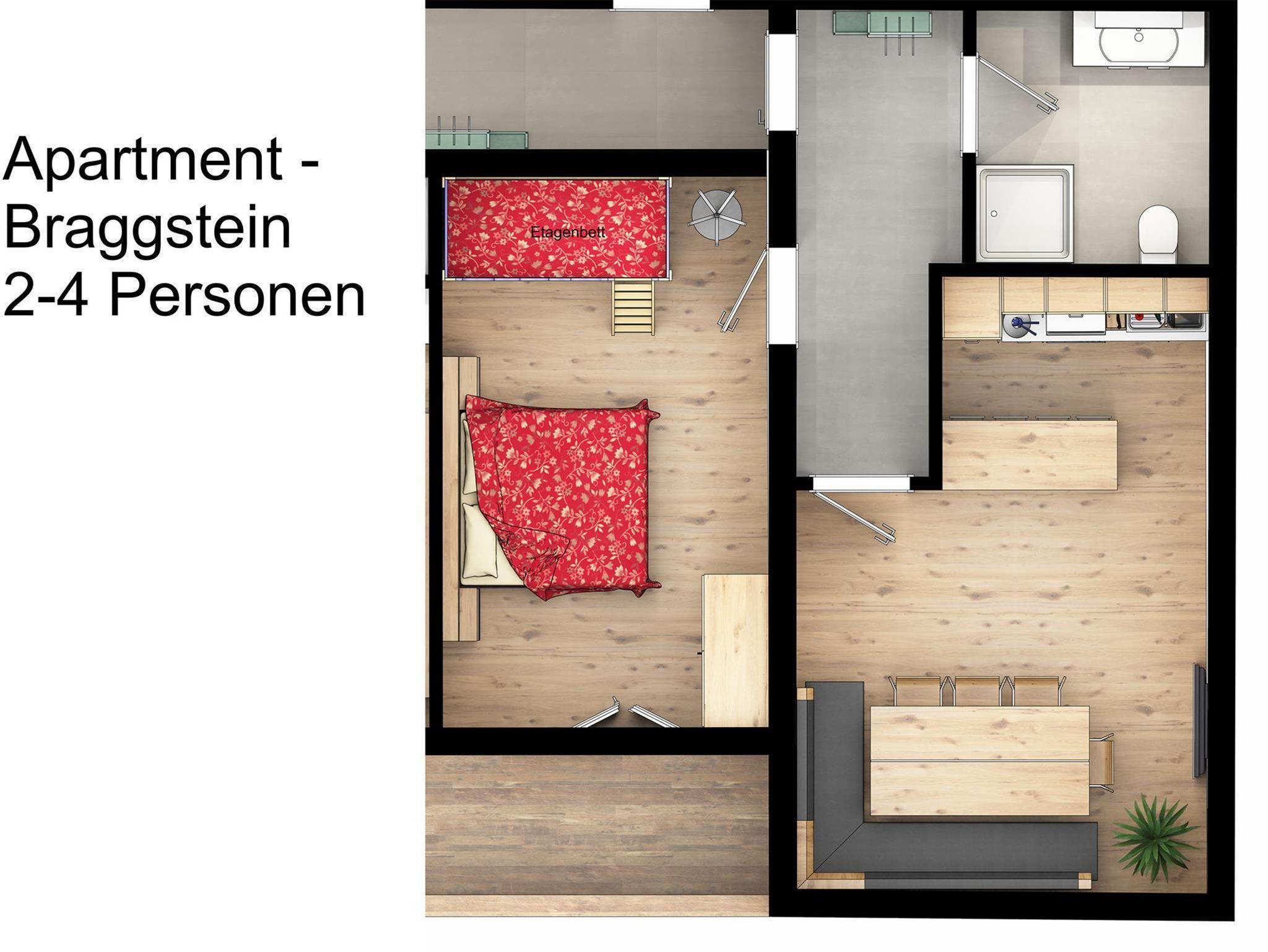 Appartement Braggstein - ca. 45m² für 2 Erwachsene und 2 Kinder. In unserem Appartement Braggstein finden Sie ein gemütliches Schlafzimmer mit Doppelbett und einem Etagenbett (nur für kleine Kinder geeignet!), eine sehr gut ausgestattete Wohnküche, und ein Bad mit Dusche und WC. Alle unsere Wohnungen haben einen bzw. mehrere Fernseher mit Kabelanschluss und freies WLAN.