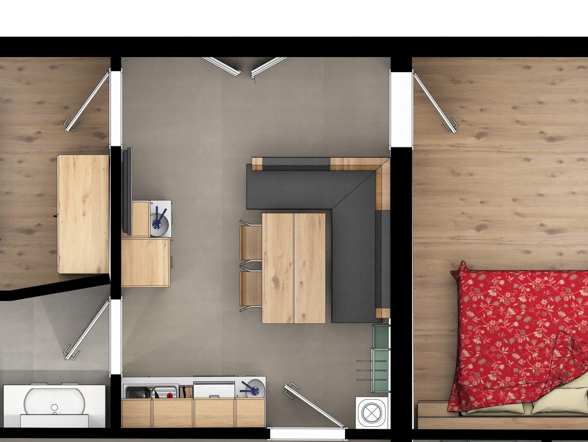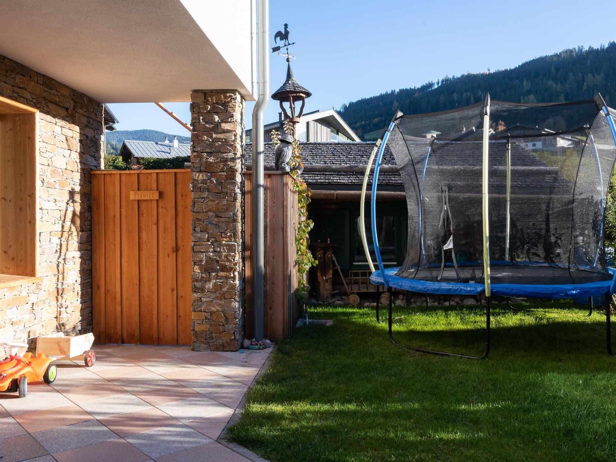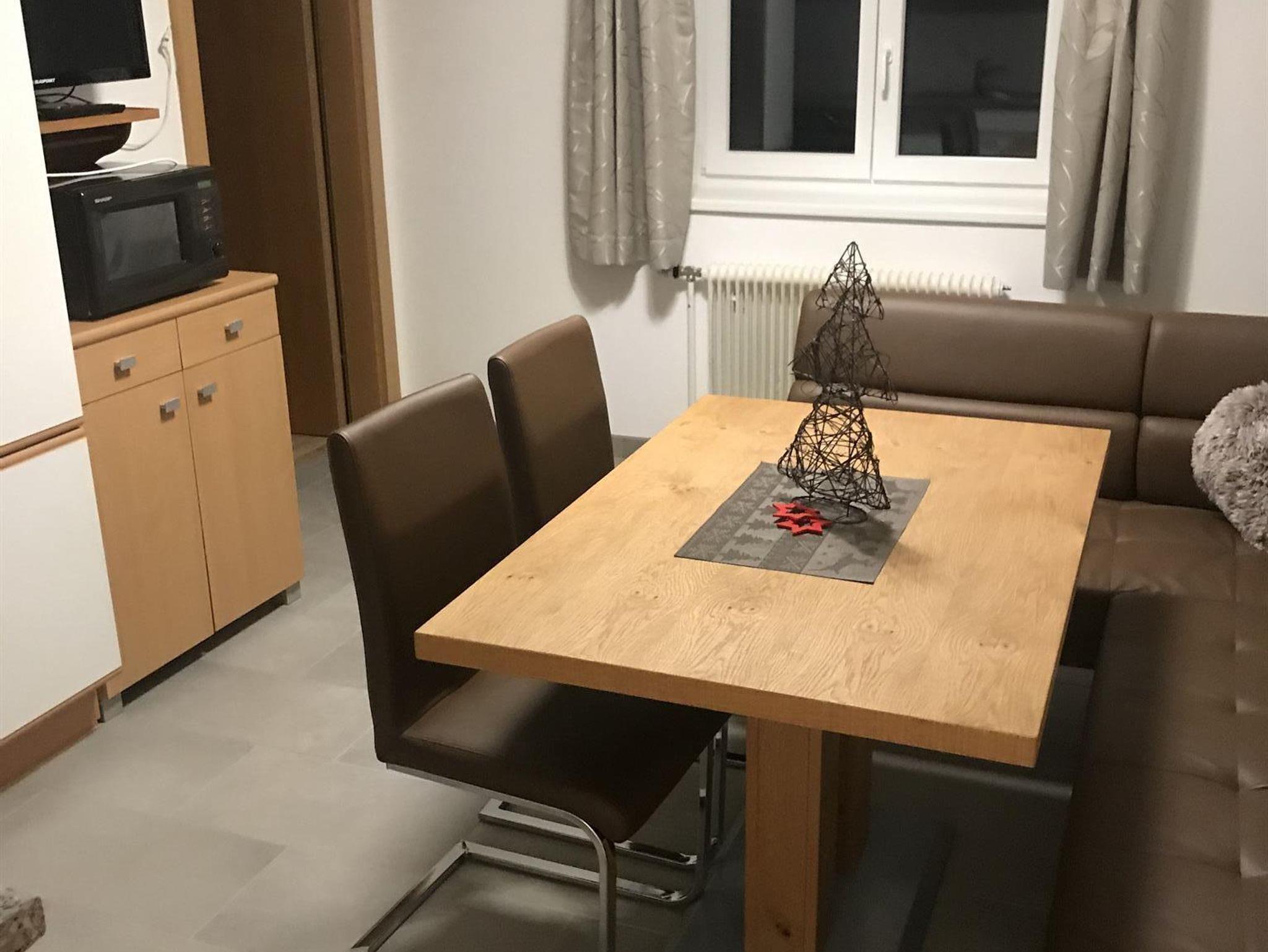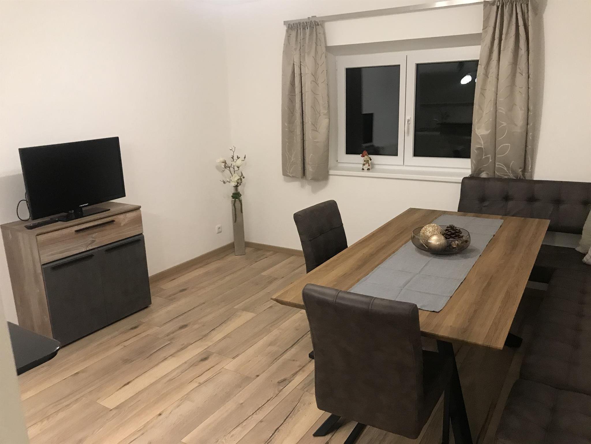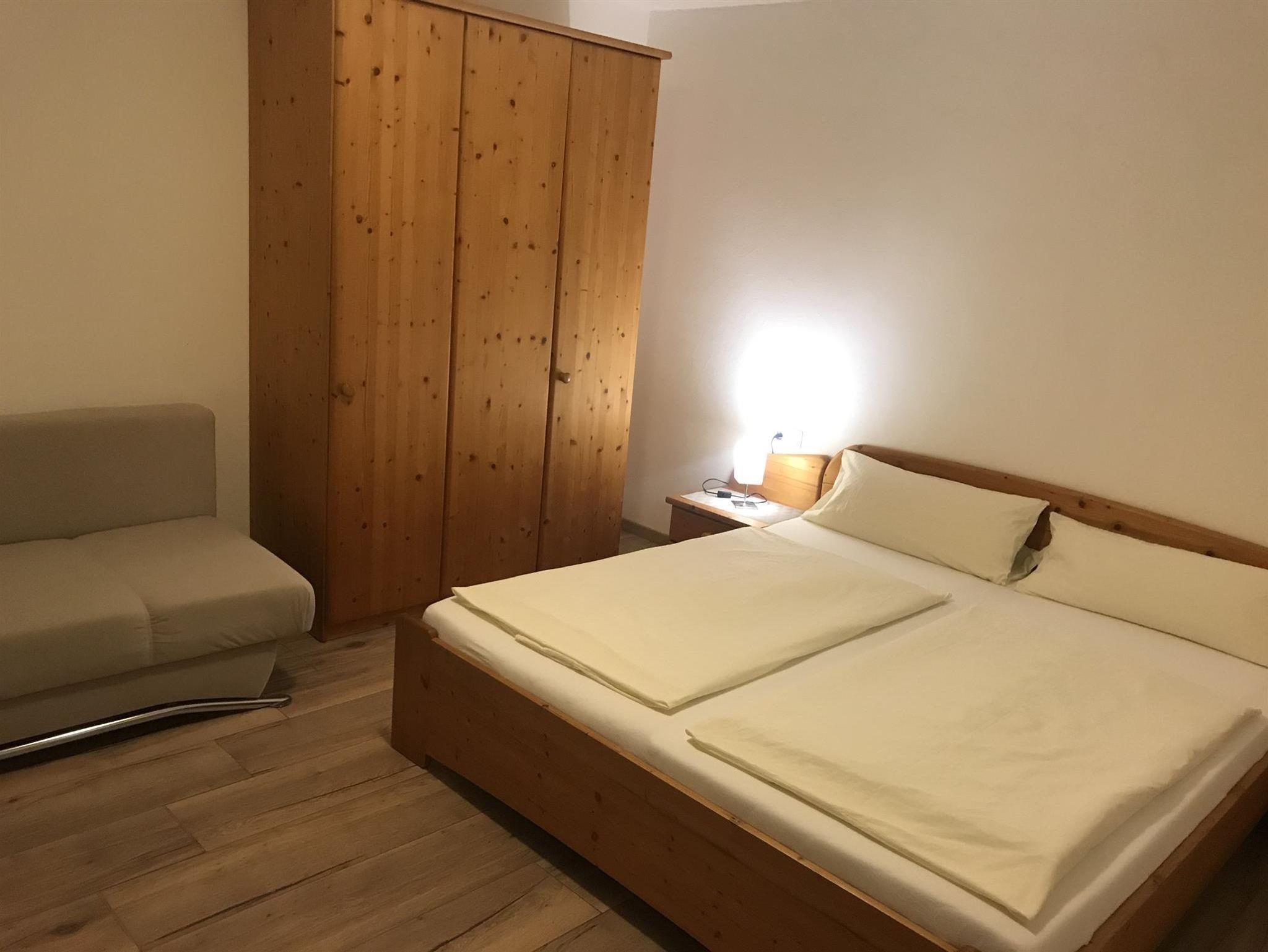 In der Wohnung befinden sich ein Schlafzimmer mit Doppelbett und einem Etagenbett (nur für kleine Kinder), ein geräumiger Wohn- und Essbereich mit großem Tisch und Kabel-TV, eine gut ausgestatteter Küche und ein Badezimmer mit Dusche und WC. Vom Schlafzimmer gelangen Sie außerdem auf den großen, sonnigen Balkon mit toller Aussicht auf den Natrun.