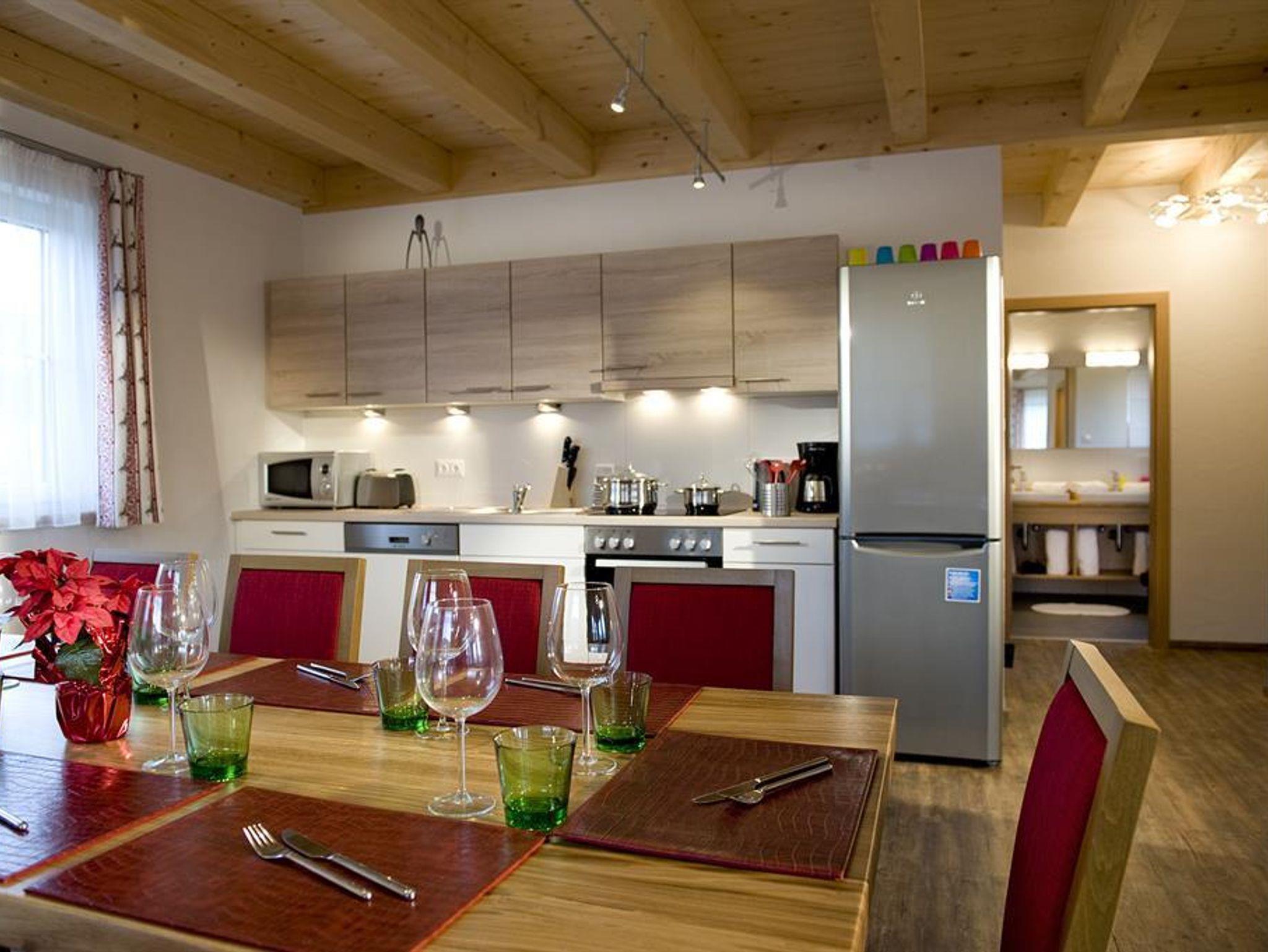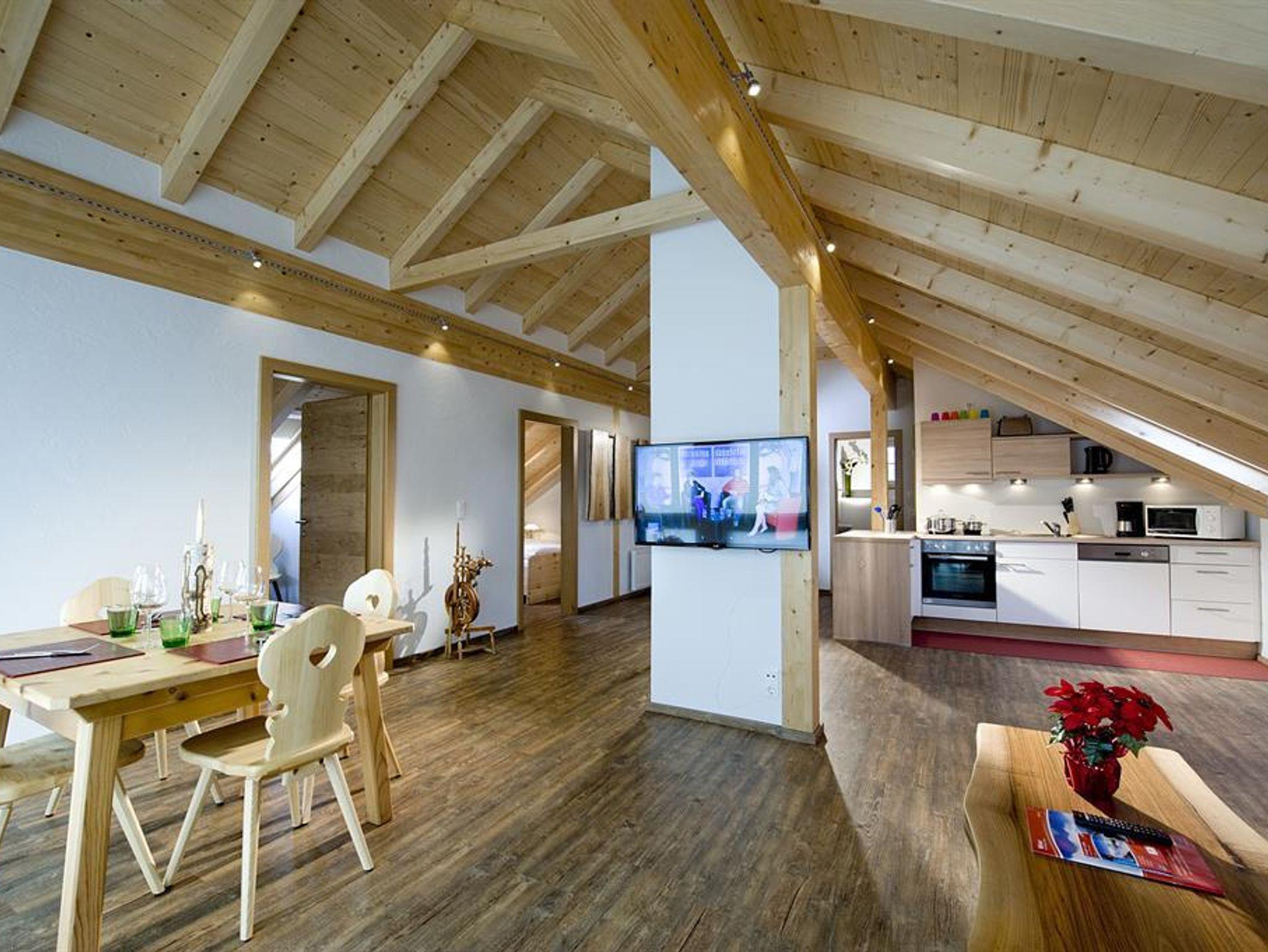 Ausreichend Platz im exklusiven Chalet mit 2 grosszügige Wohnküchen komplett ausgestattet sind mit Esstisch für 6-14 Personen, Flat-TV und Sitzmöglichkeiten sowie Couchen (als Doppelausziehbett möglich).