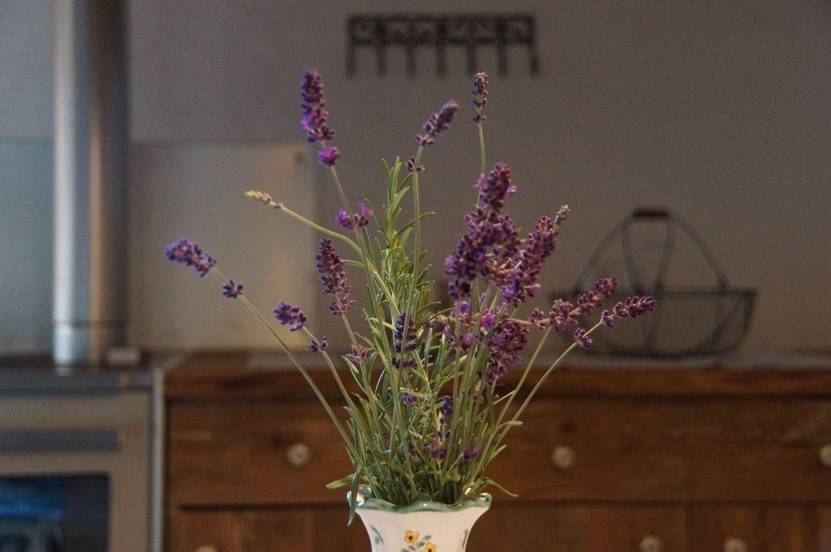 Wohnküche mit Holzofenherd mit Backofen, Kühlschrank, Kaffeemaschine, Wasserkocher, Toaster & Mixer