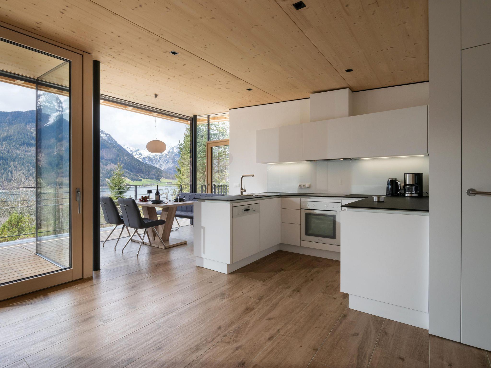 Die FW ist 69 m2 groß. Im Wohnzimmer befindet sich eine Schlafcouch für 2 Personen, ein Essbereich für 4 Personen, eine hochwertige Einbauküche mit Komplettausstattung wie Miele Elektroherd, Geschirrspüler, Kühlschrank, Porzellan von Villeroy&Boch, Besteck, Gläser, Küchenhelfer bester Qualität. Sat-Fernseher und Wlan vorhanden. Vom Wohnraum kommt man durch die große Glasschiebetür hinaus in die Loggia und Balkon. Genießen sie dort den wunderbaren Seeblick. Über die begrünte Terrasse kommt man direkt in den angrenzenden Wald. Das Badezimmer mit Dusche ist schön ausgestattet, das WC befindet sich in einem eigenen Raum. Handtücher ausreichend vorhanden. Im Schlafzimmer befindet sich ein Doppelbett, ein großer Schrank, ein Fernseher. Bettwäsche vorhanden. Der große Vorraum mit Gardarobe bietet viel Platz. Die Komplettverglasung bietet einen Blick in den unberührten Wald. Parkplatz und versperrbarer Abstellraum für Sportgeräte vorhanden.