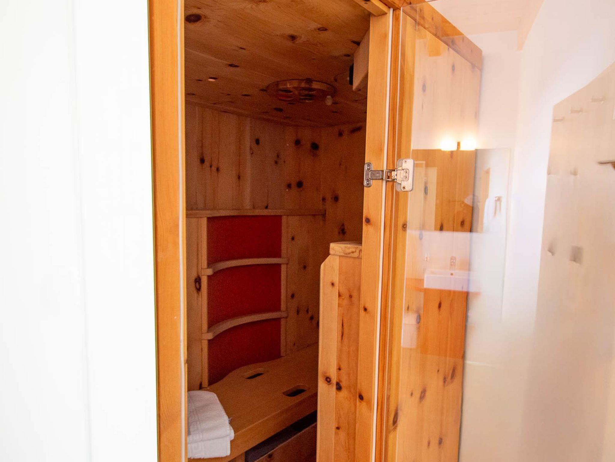 Das geräumige Badezimmer verfügt über eine integrierte Wellnesskabine, in der Sie nach einem erlebnisreichen Tag wohltuende Wärme und absolute Ruhe genießen können – ganz privat, wann immer Sie möchten.