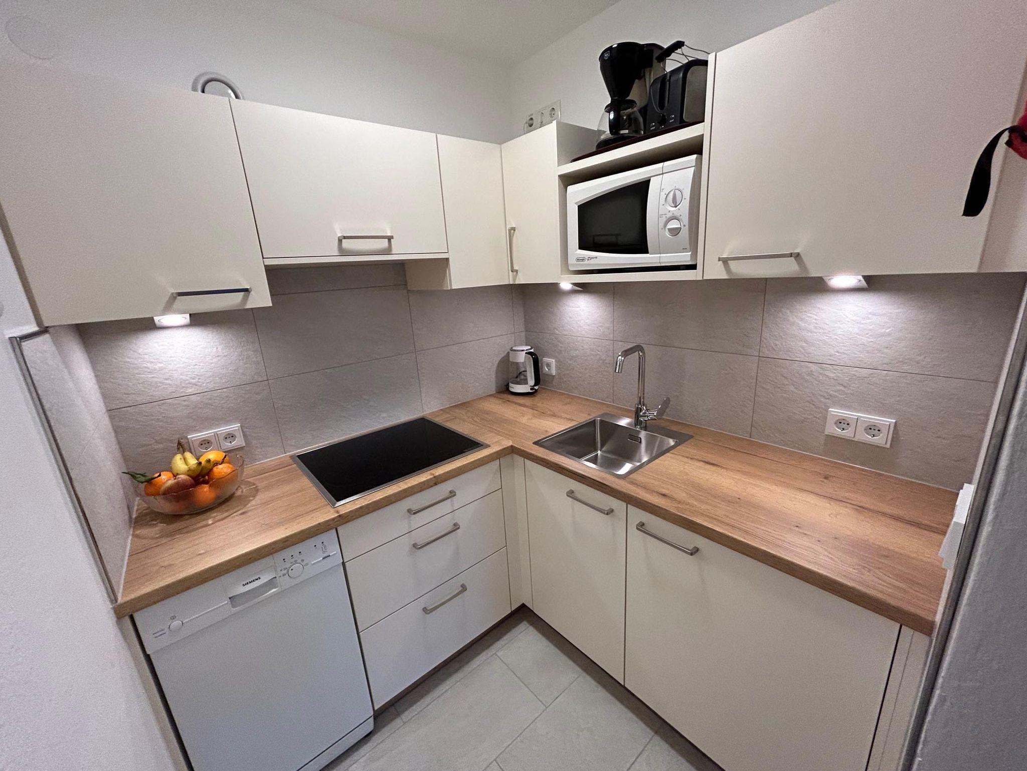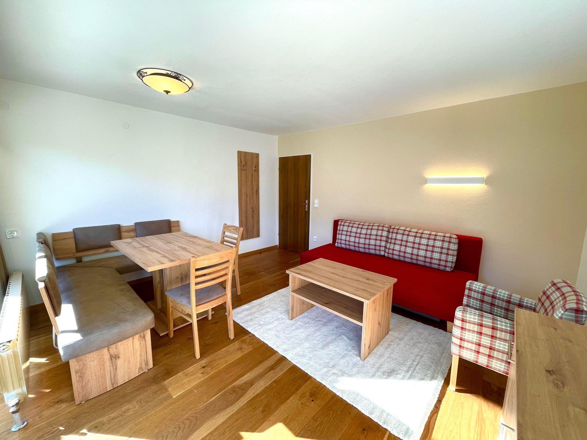 Wohnschlafzimmer mit zwei Couches und Tischchen, gepolsterter Eßecke und Bauernkomode. Dreibettzimmer mit 2 Fauteuils und Tischchen, Wandvertäfelung. Große Schiebetüre zum Liegebalkon bzw. zur Gartenterasse. Vorraum mit Schrank. Frisch renoviertes Badezimmer mit Dusche, Waschbecken, WC und Heizstrahler. Separate Küche mit 3-Platten-Herd, Kühlschrank, Geschirrspülmaschine, Mikrowellenherd, Dunstabzug, kompl. Geschirr, Kaffeemaschine. Farb-TV, Safe, Internetanschluss. Haustiere sind nicht erlaubt!