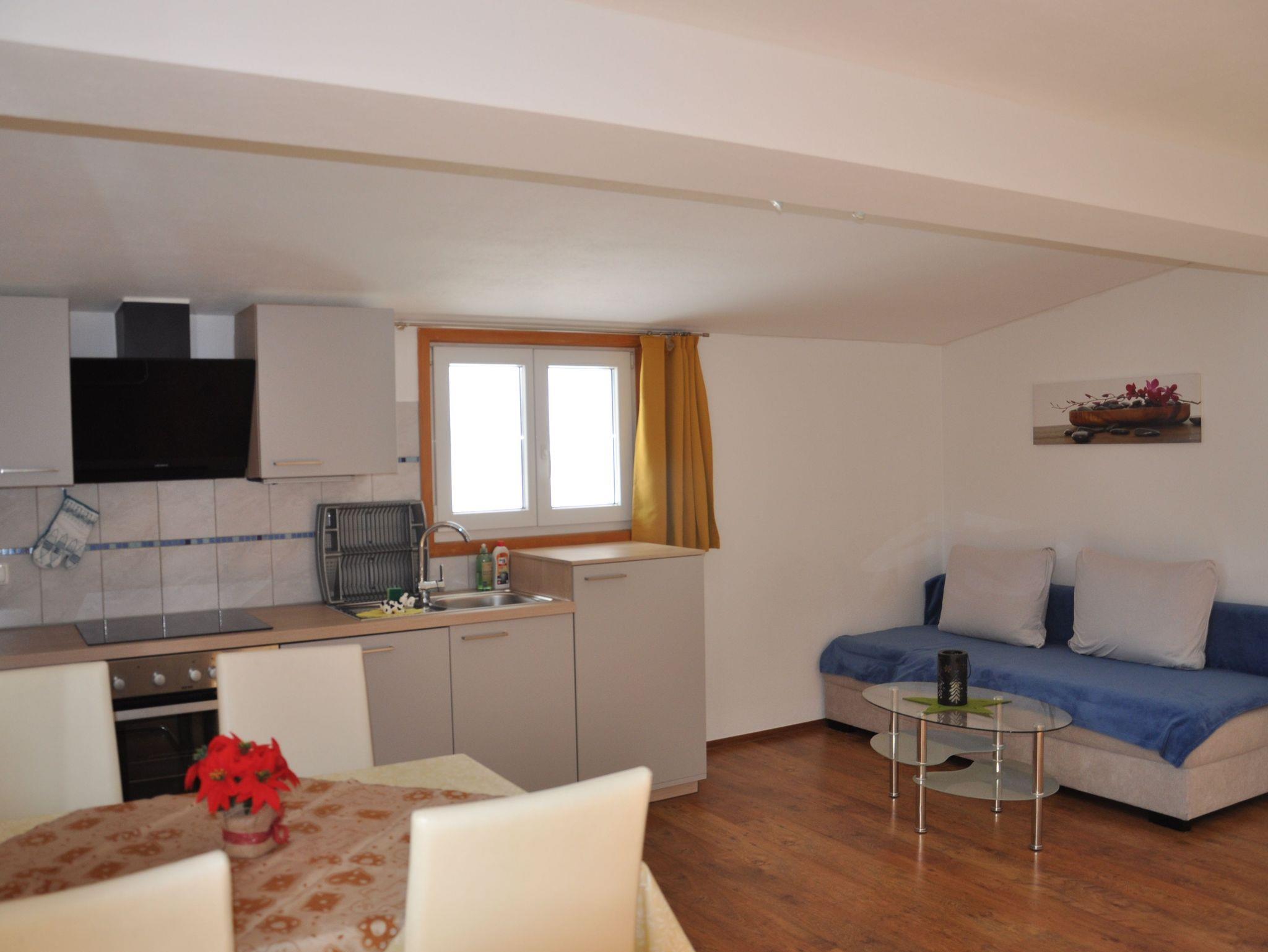 Das Apartment im 2. Obergeschoss für max. 3 Erwachsene verfügt über ein Schlafzimmer mit Doppelbett, ein Badezimmer mit Dusche/WC und ein Wohnraum mit Küche und Schlafsofa.