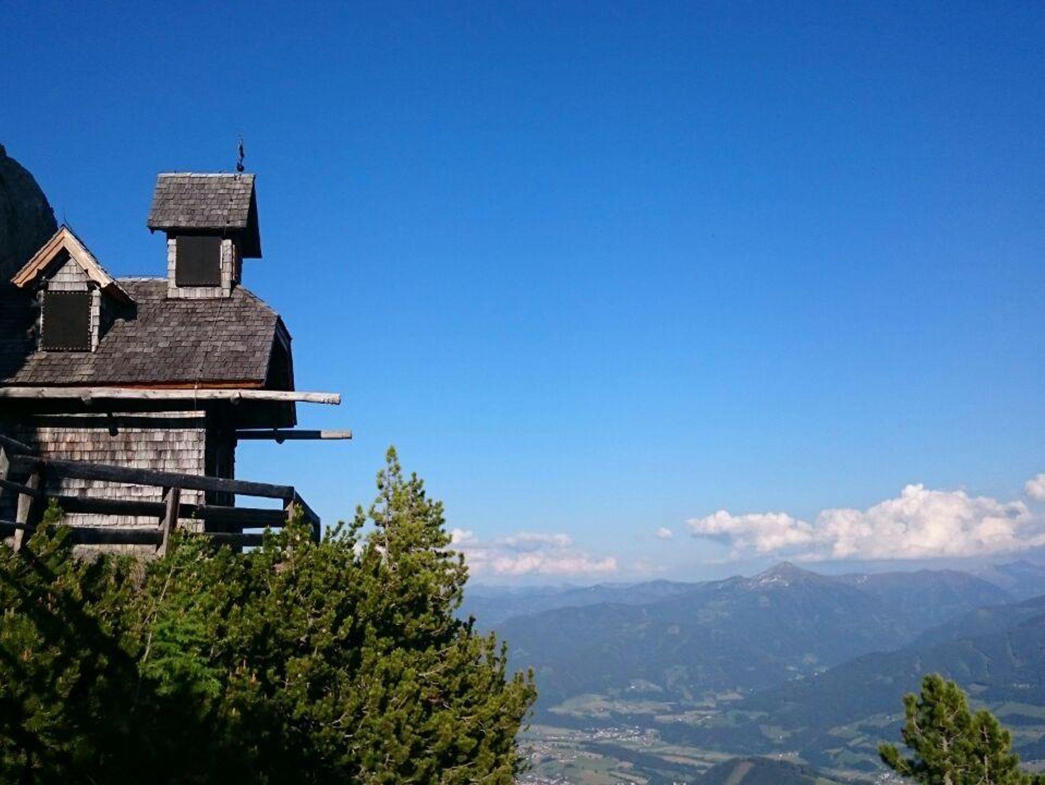 Geräumiges Familienzimmer mit einem Doppelbett und zwei Einzelbetten. Von diesem Zimmer hat man das ganze Geschehen am Hof im Überblick und genießt eine wunderschöne Aussicht auf den Dachstein.
