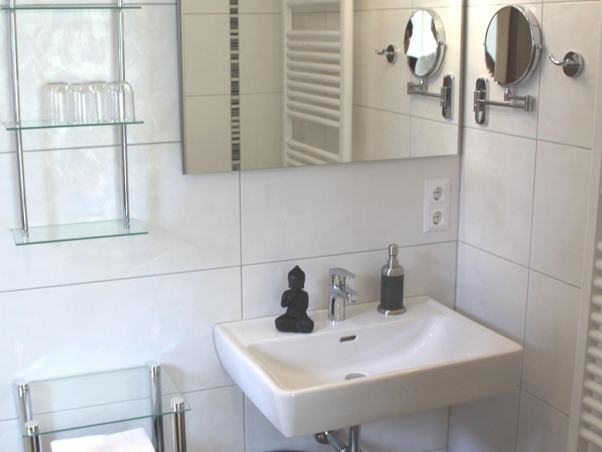 Das Badezimmer ist komplett neu, mit Dusche, Waschbecken, Waschmaschine und Wäscheständer.