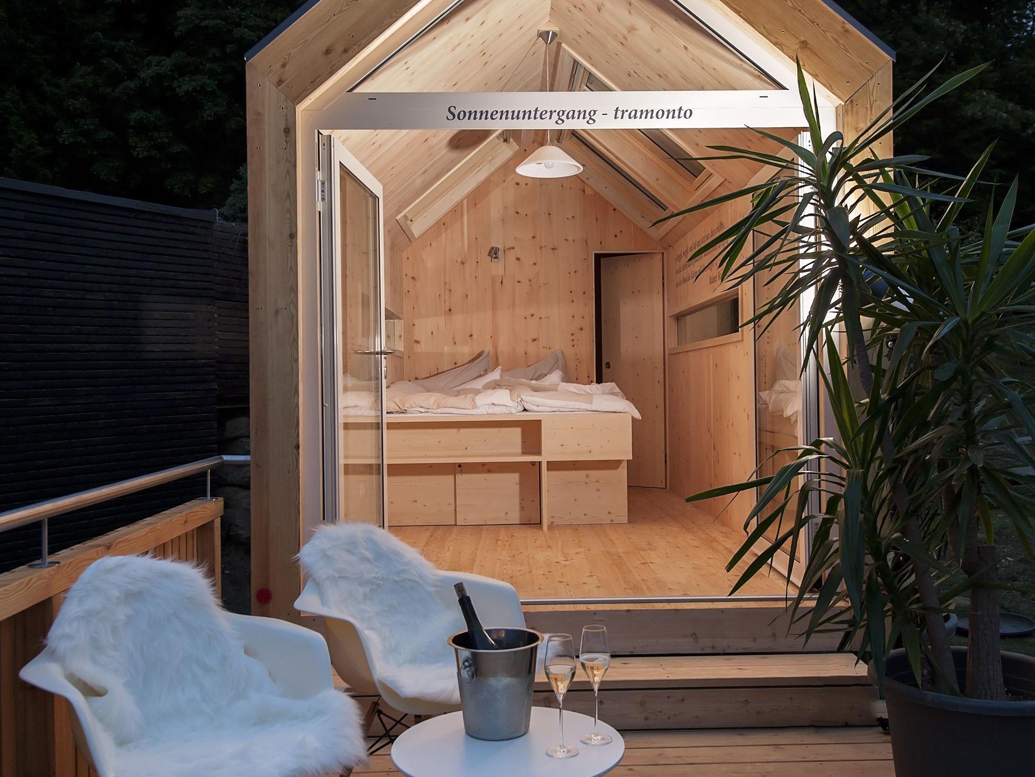Aus heimischem Holz gefertigt bietet das Biwak Platz für ein Bett, einen Tisch samt Stühlen mit kuscheligem Lammfell sowie einen getrennt zugänglichen Waschraum. Mobilgeräte, Schlüssel und Terminkalender verstauen Sie in einem kleinen Fach, um die Zweisamkeit ganz ungestört zu erleben.