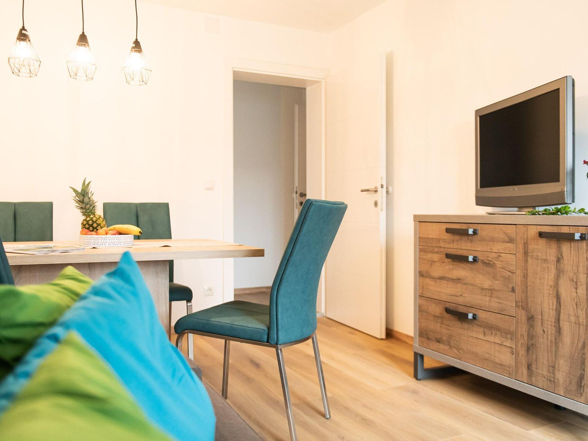 Das 30 m² große Appartement Feldgrille verfügt über ein gemütliches Schlafzimmer für zwei Personen, eine praktische Küche, einen kleinen Essbereich sowie eine Wohnecke zum Entspannen. Das Badezimmer ist mit Dusche und WC ausgestattet. Ein 7 m² großer, überdachter Balkon lädt zum Verweilen im Freien ein – ideal, um den Tag entspannt ausklingen zu lassen.