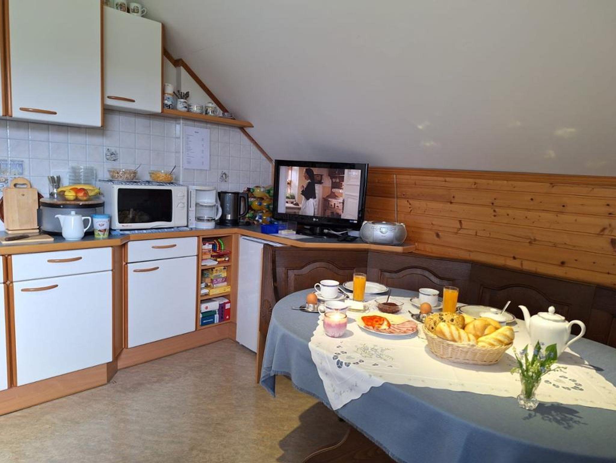 Genießen Sie am Morgen ein köstliches Frühstück, das im gemütlichen Frühstücksraum serviert wird, wo Sie auch unterhaltsame Bücher und Spiele vorfinden.