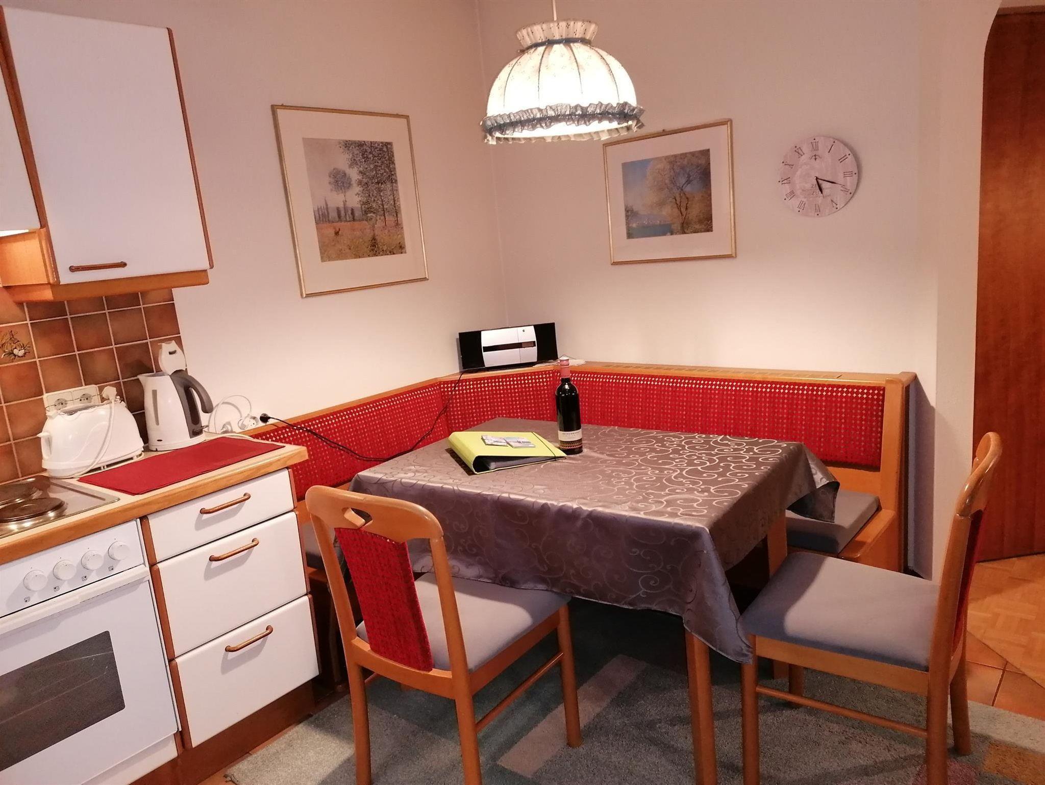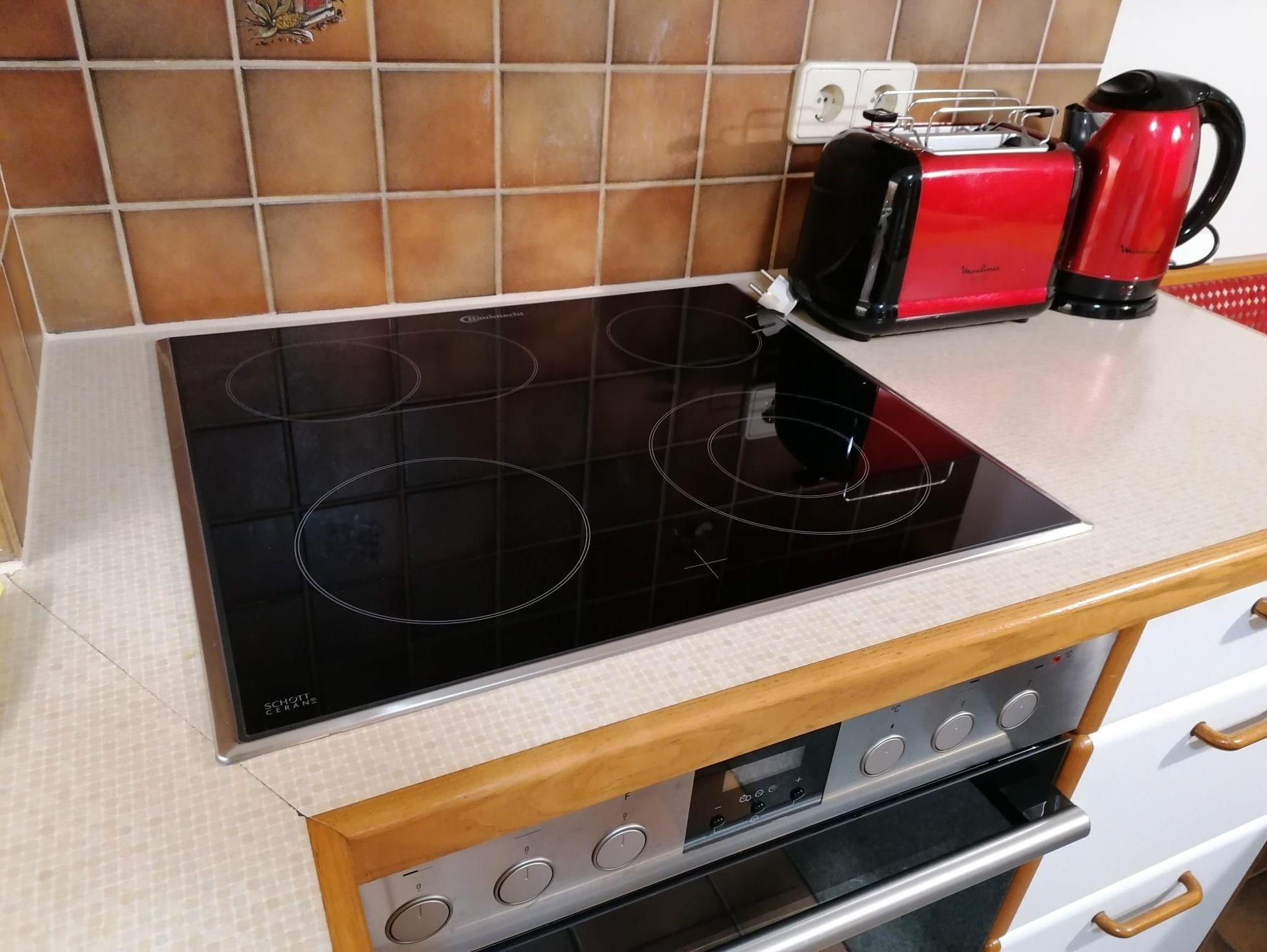 1 Küche mit großem Esstisch, Kaffeemaschine, Mikrowelle, Toaster, Kühlschrank/Gefrierfach, E-Herd mit Backofen, Fön, Bügeleisen, CD-Player und Radio