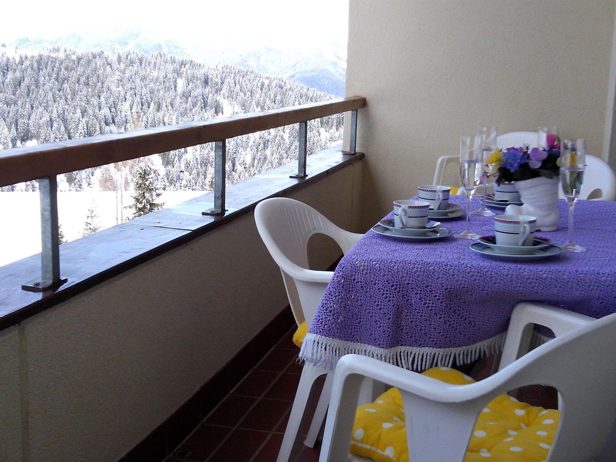 1 großen West-Balkon mit Sitzgarnitur, Tisch und Sonnenschirm sowie schönem Ausblick ins Dorfgeschehen und auf die Berge,