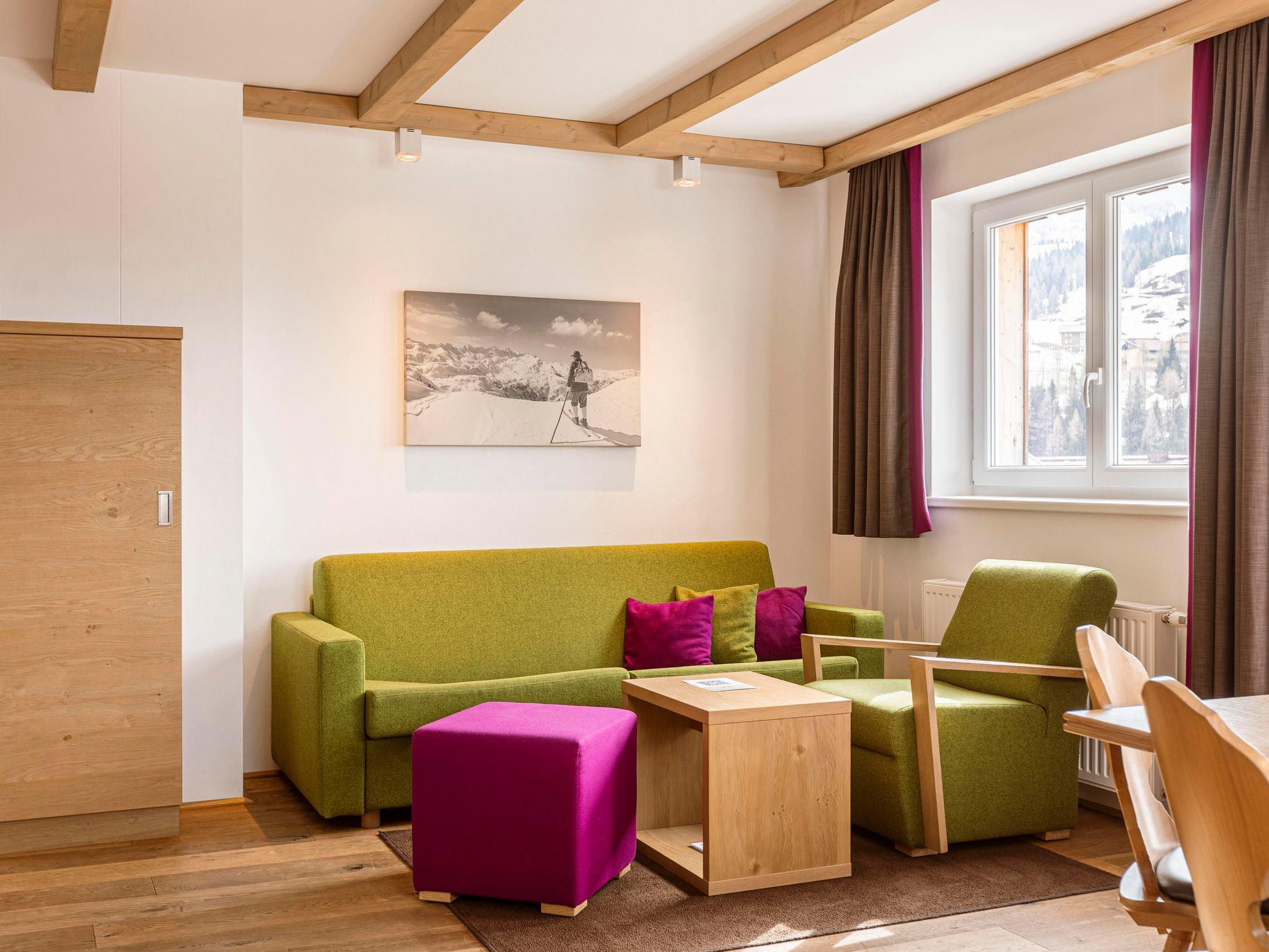 auf zwei Ebenen, für 2 – 6 Personen, 2 Schlafzimmer (2x Doppelbett), 2 Bäder (Bad mit Dusche/WC und Bad mit Wanne/WC), eigene Bergsauna, Balkon, gemütliche Sitzecke, 3x SAT-TV, Zimmersafe, verschließbares Skidepot.