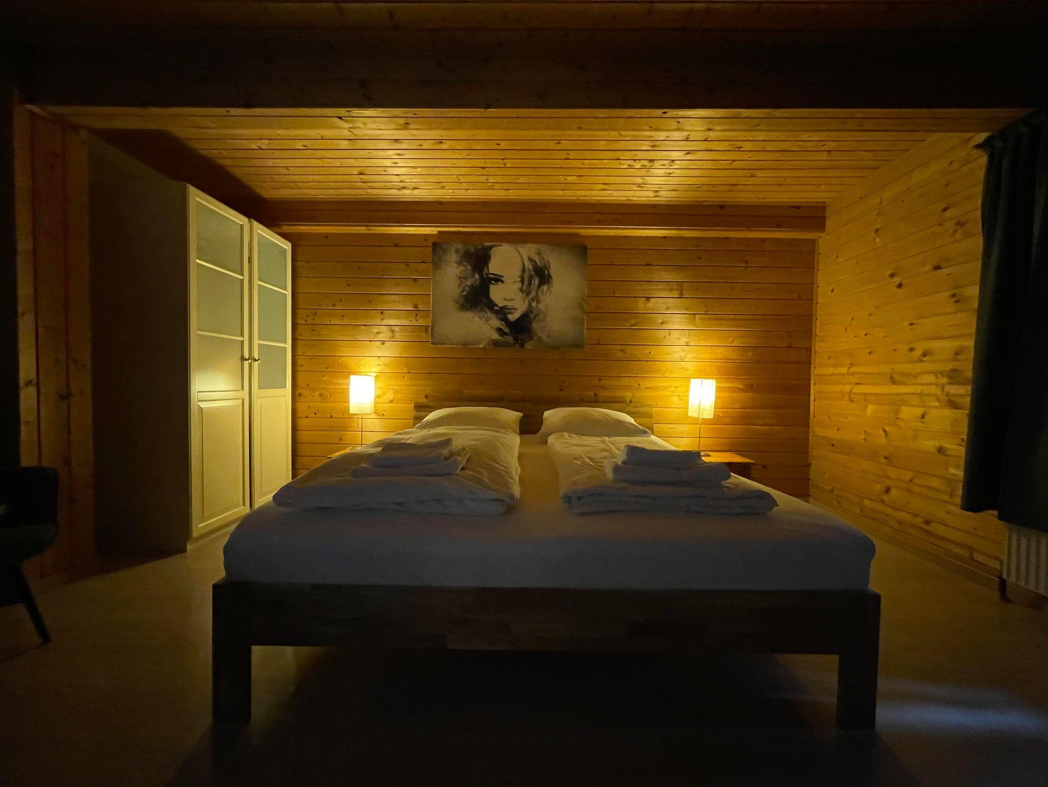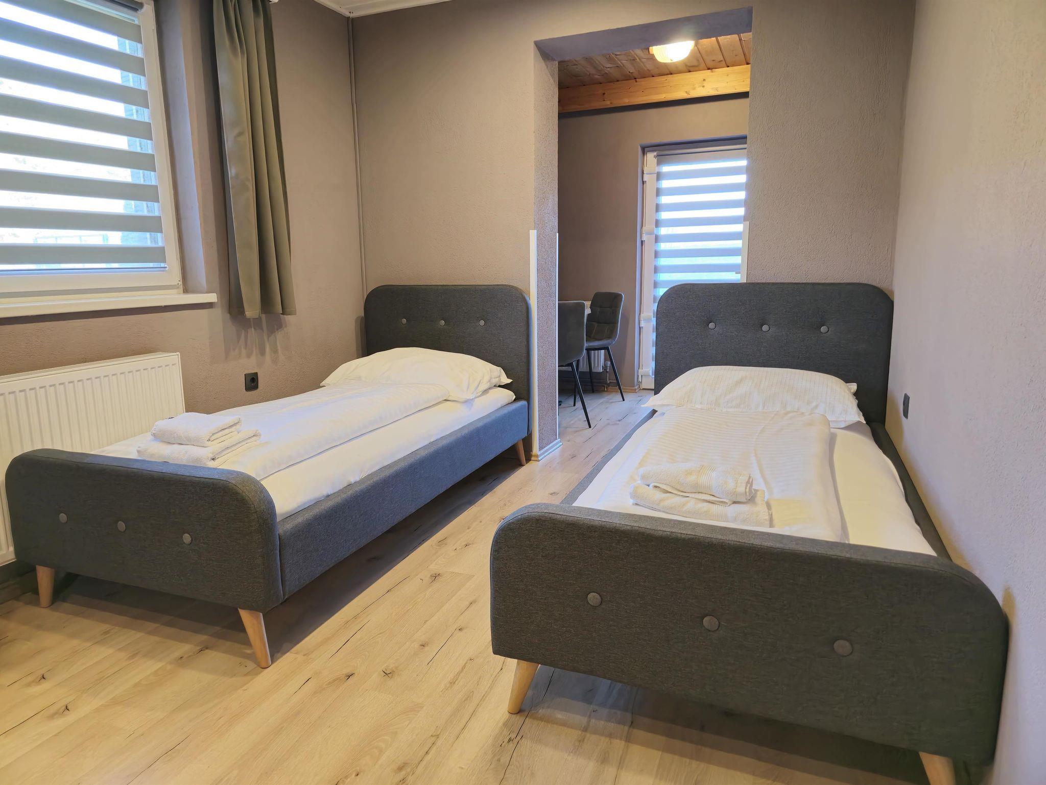 Dich erwartet ein 3-Bett-Zimmer, mit einem Doppelbett und Einzelbett. Außerdem gibt es ein Badezimmer. (Dusche, WC, Einzelwaschbecken)