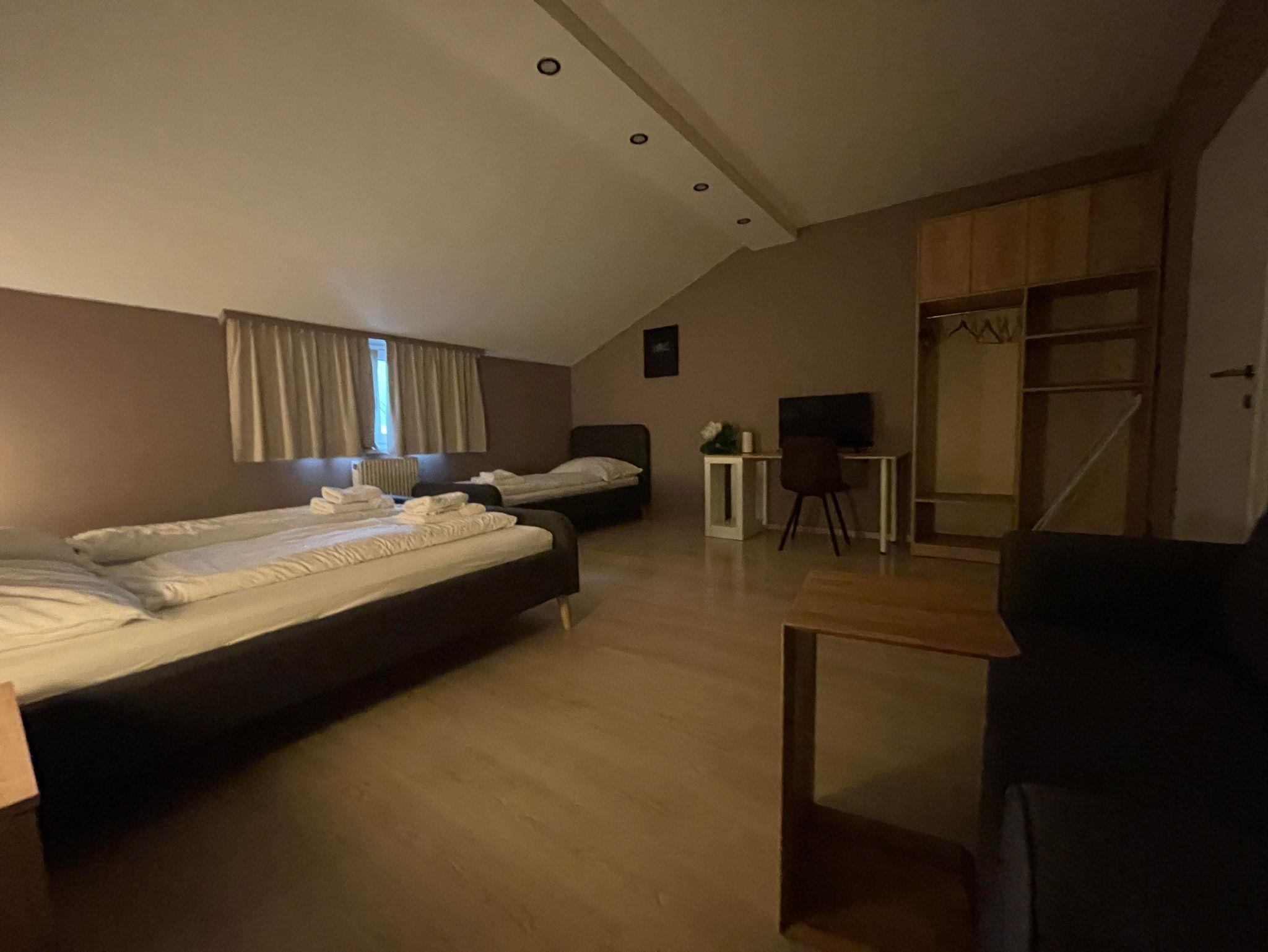 Dich erwartet ein Apartment mit zwei Schlafzimmern, Küche und Badezimmer. Ein Schlafzimmer hat ein Doppelbett und ein Einzelbett. Das kleinere Schlafzimmer hat zwei Einzelbetten.