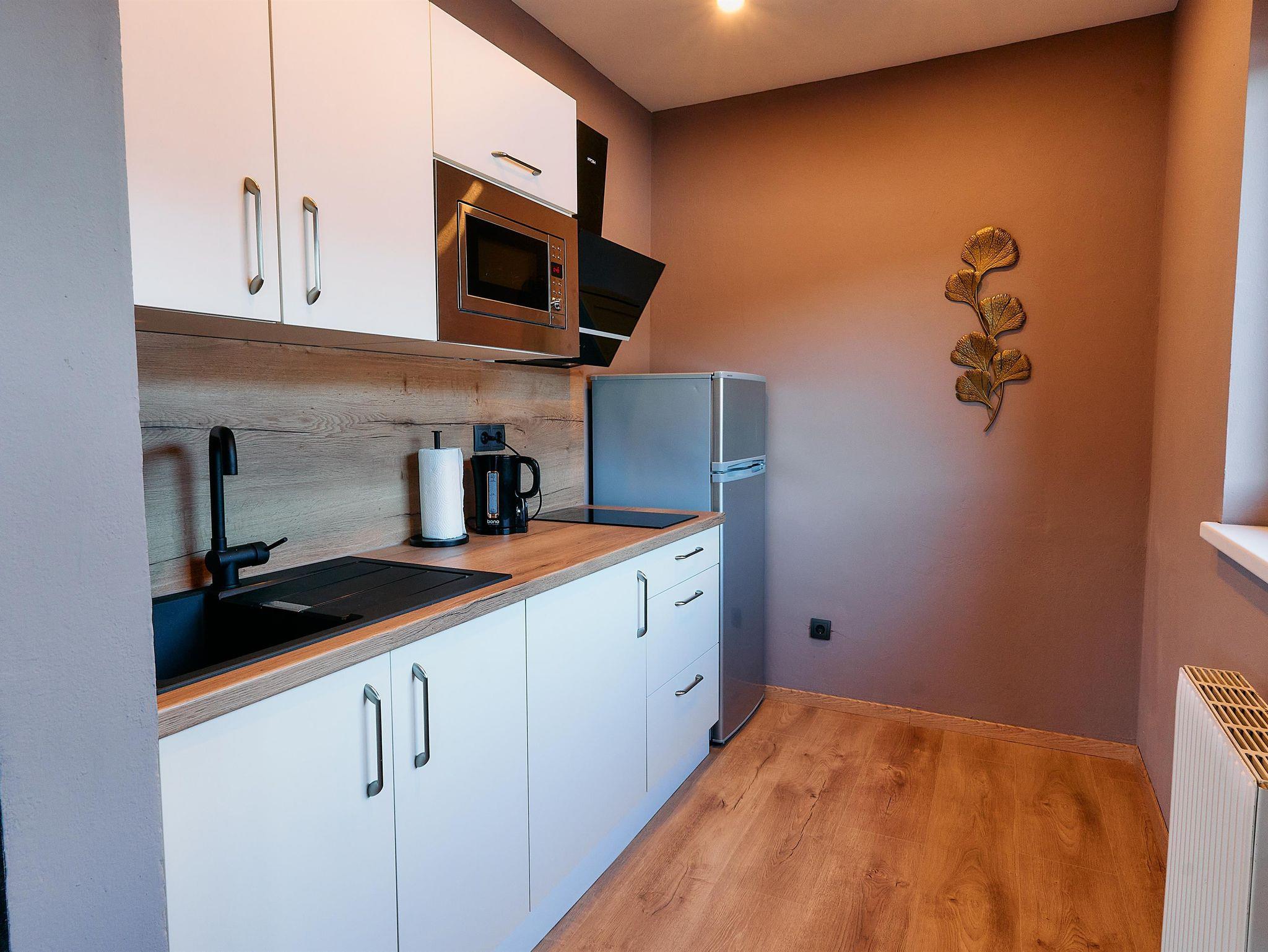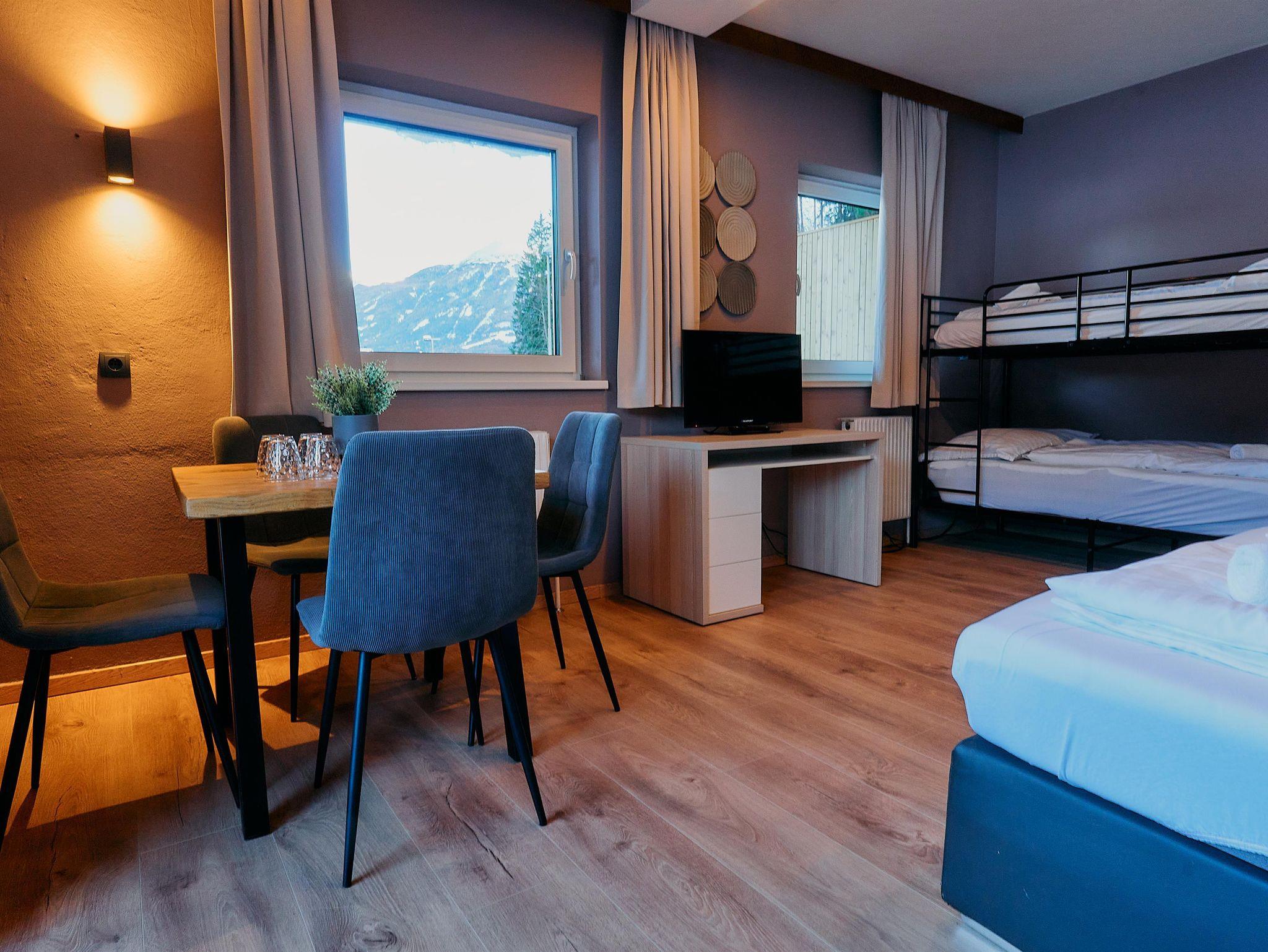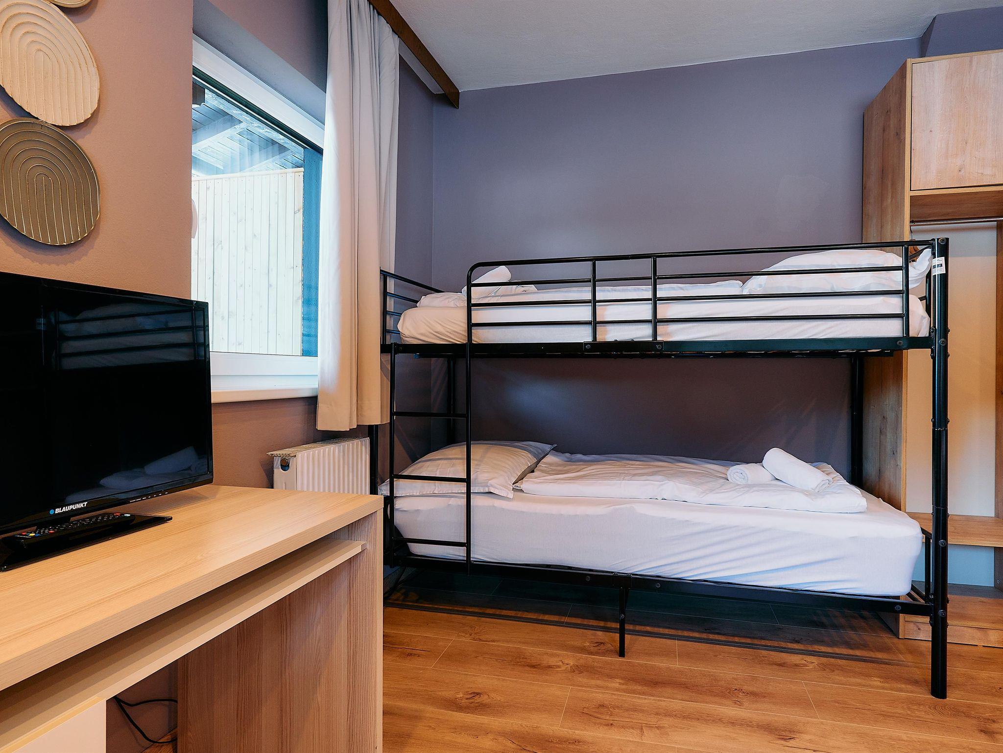 Dich erwartet ein Apartment mit einem Doppelbett sowie einem Stockbett, Küche, Badezimmer und einem Balkon.