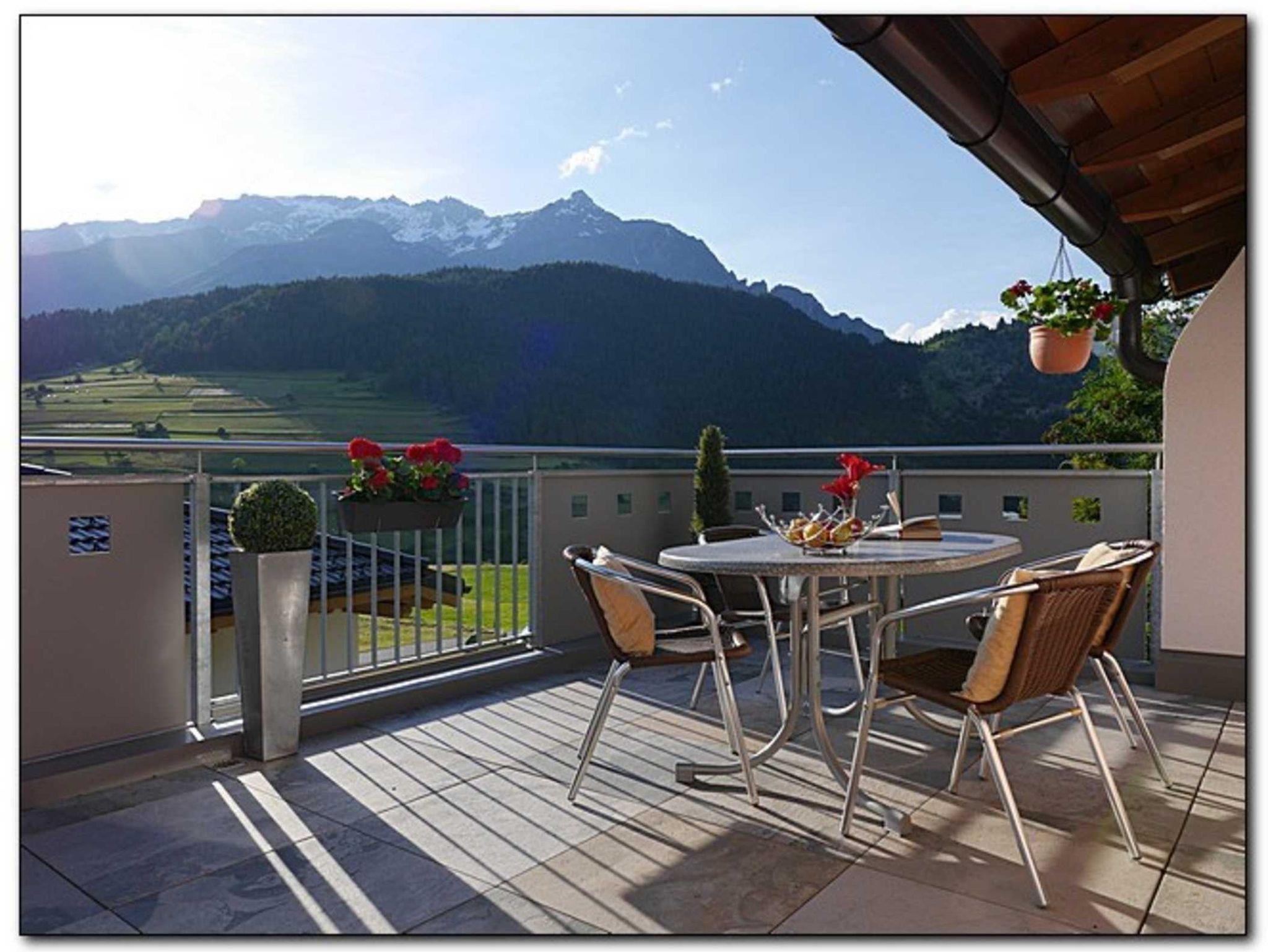 • Große Gartenterrasse im Grünen (west-südseitig) mit wunderschonen Ausblick auf die schweizer Berge mit Gartenmöbel und Sonnenschirmen