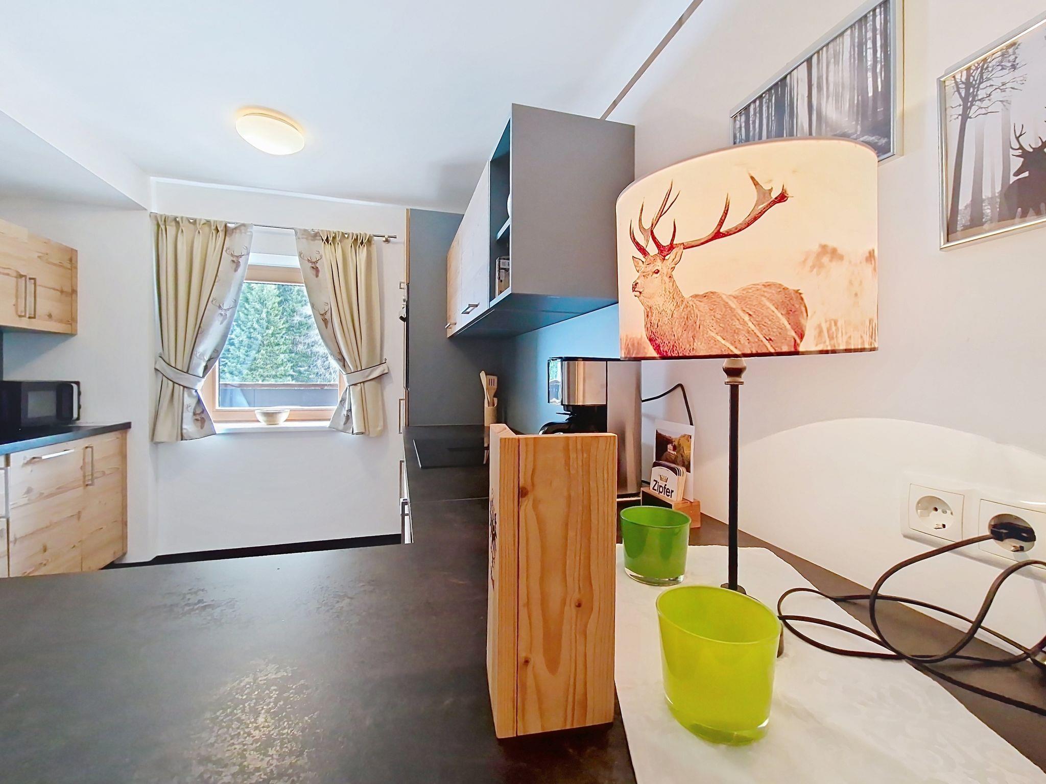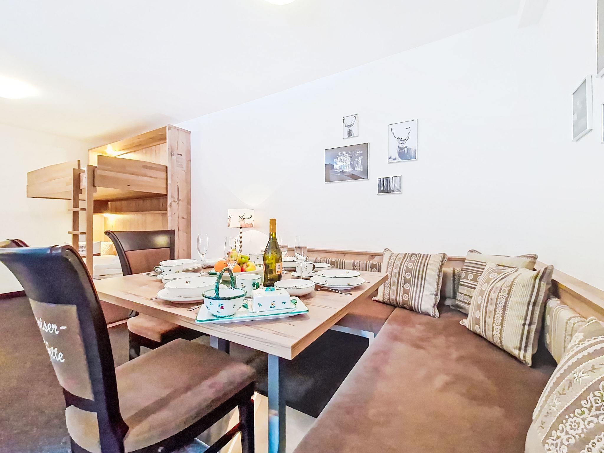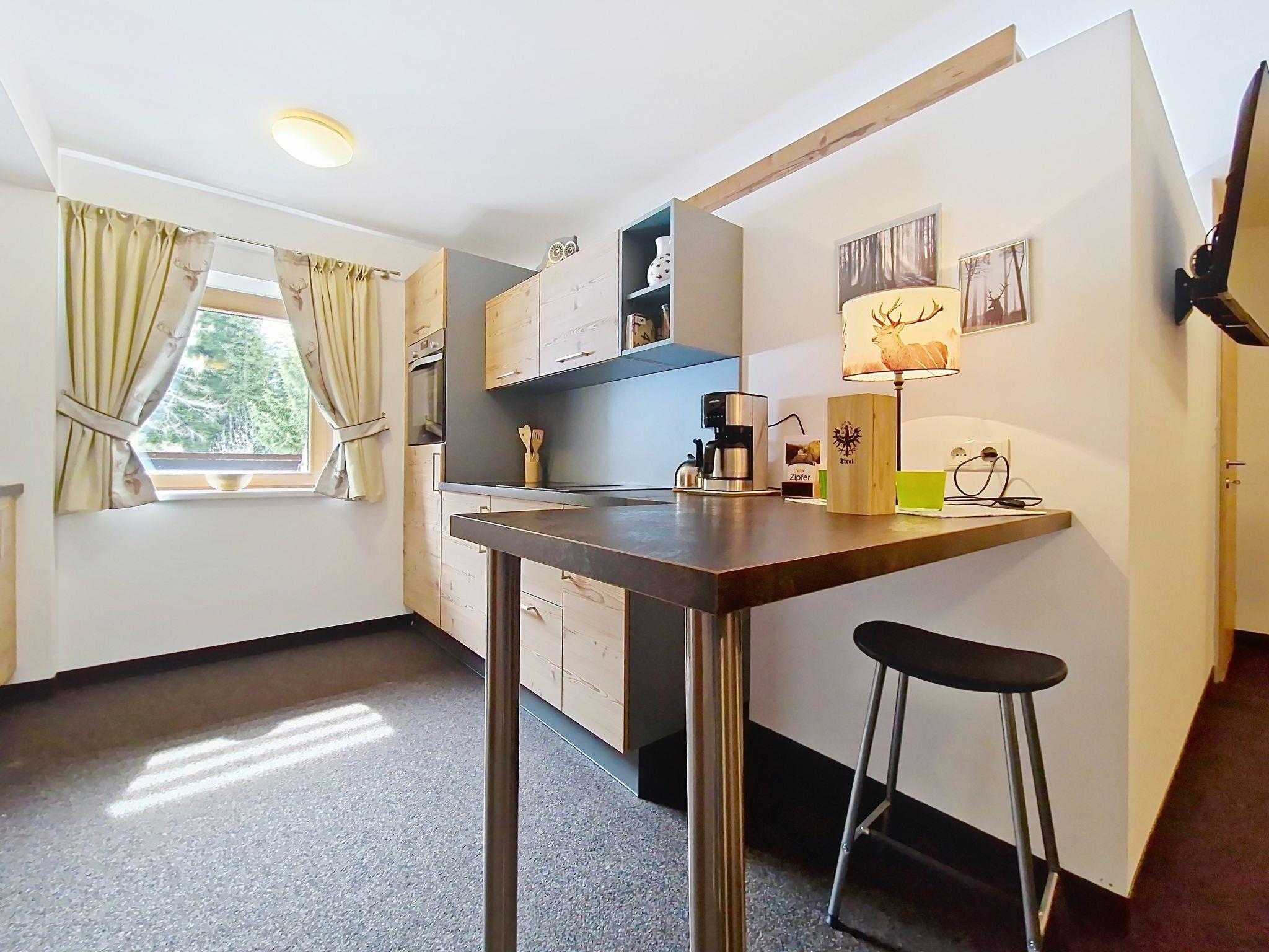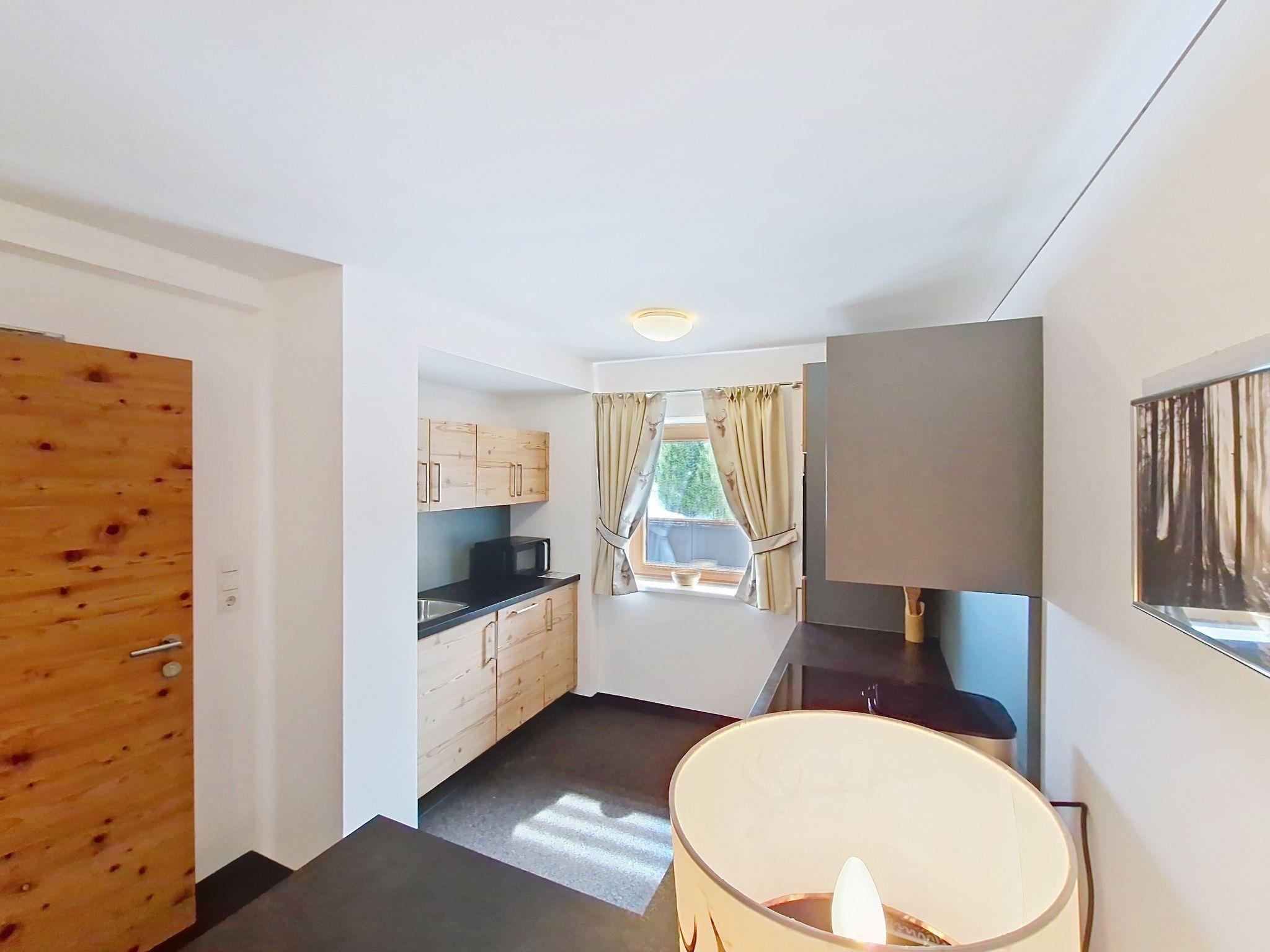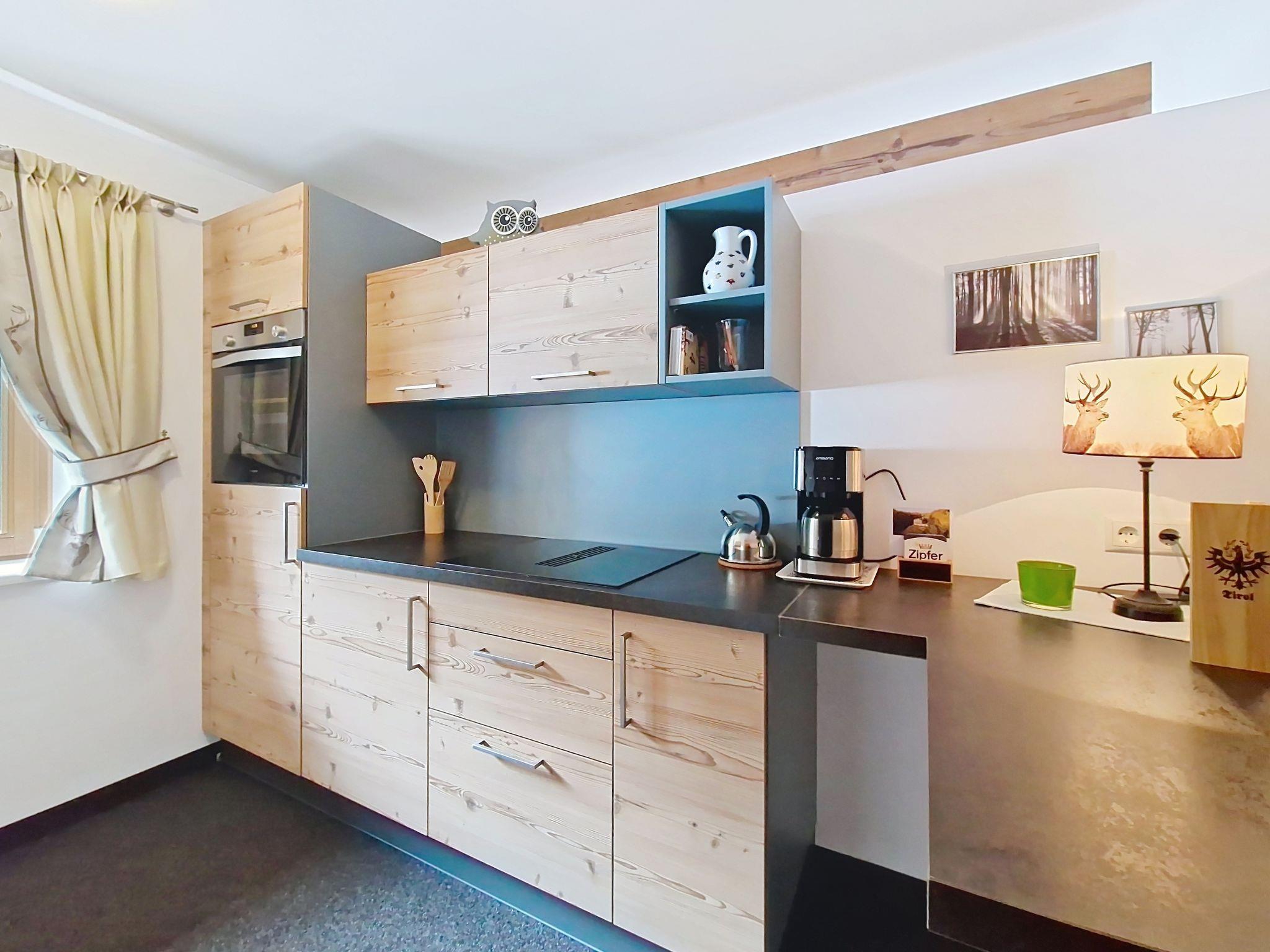"Kreuzjoch", 2-room apartment 50 m2 on 1st floor. Tasteful and cosy furnishings: 1 double bedroom. Large kitchen-/living room (dishwasher, 4 ceramic glass hob hotplates, kettle, microwave, electric coffee machine) with bar, 1 x 2 bunk beds (90 cm, length 200 cm), dining nook and TV (flat screen). Shower/WC (private). Wood heating. Carpet. Very beautiful panoramic view of the mountains and the valley. Facilities: Internet (WiFi, free). Please note: fridge without freezer, non-smokers only. Smoke alarm, fire extinguisher.