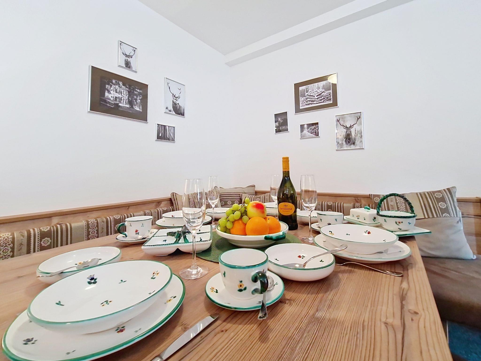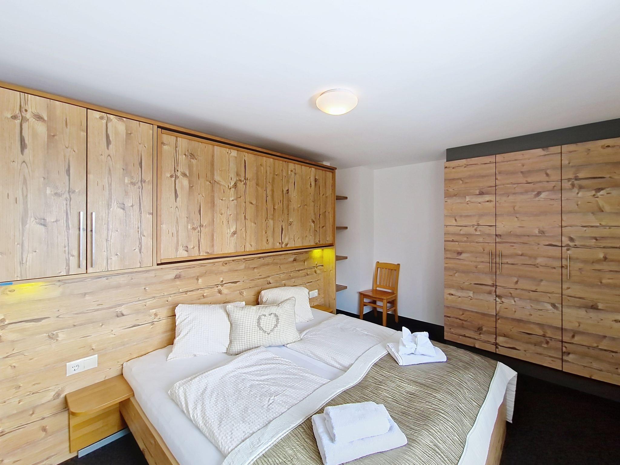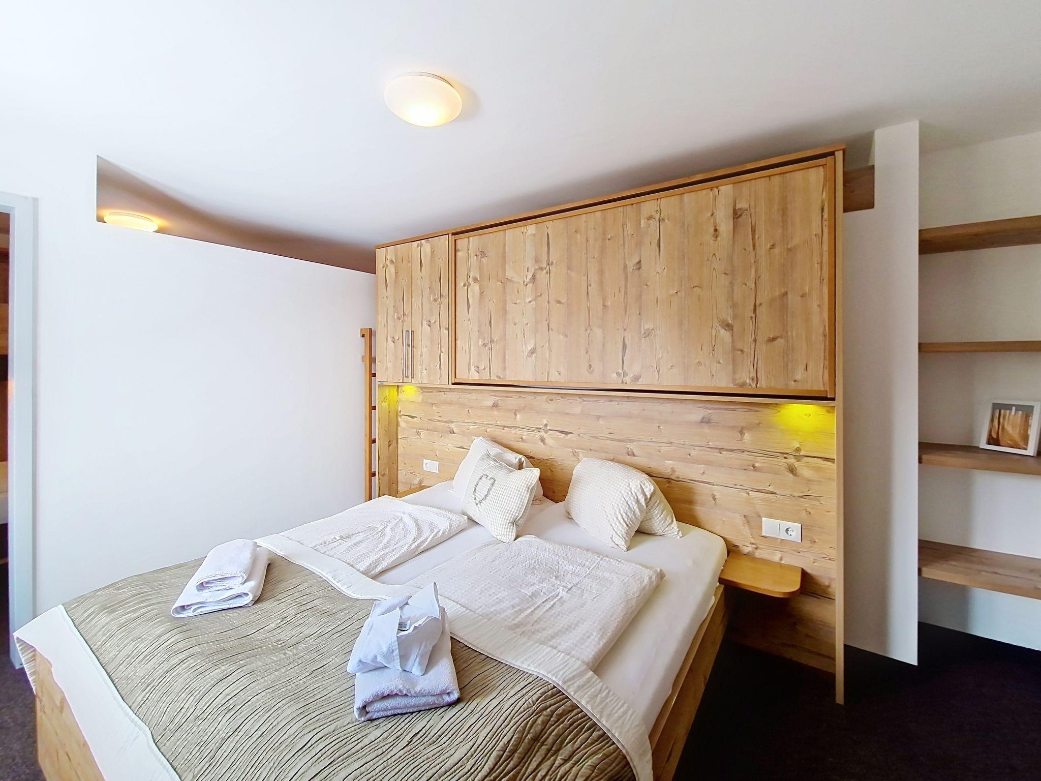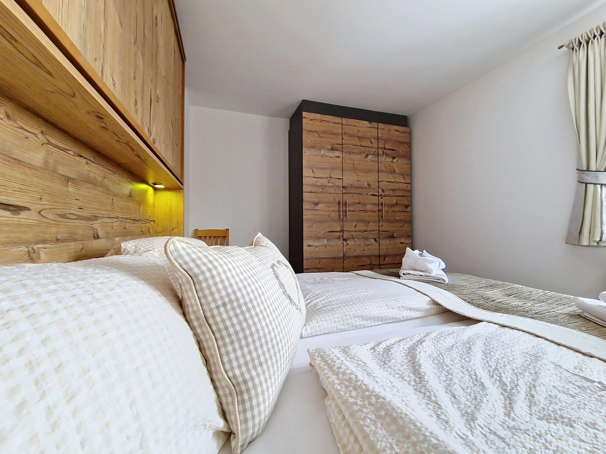 "Kreuzjoch", 2-room apartment 50 m2 on 1st floor. Tasteful and cosy furnishings: 1 double bedroom. Large kitchen-/living room (dishwasher, 4 ceramic glass hob hotplates, kettle, microwave, electric coffee machine) with bar, 1 x 2 bunk beds (90 cm, length 200 cm), dining nook and TV (flat screen). Shower/WC (private). Wood heating. Carpet. Very beautiful panoramic view of the mountains and the valley. Facilities: Internet (WiFi, free). Please note: fridge without freezer, non-smokers only. Smoke alarm, fire extinguisher.