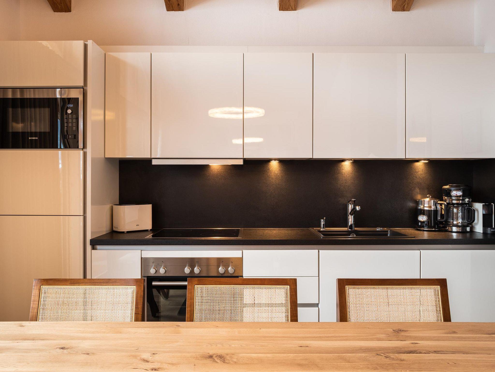- Offene Küche: Voll ausgestattet mit Wasserkocher, Toaster, 4-Platten-Keramikherd, Kaffeemaschine (Nespresso Kapsel & Filter), Backofen, Mikrowelle, Geschirrspüler, Kühlschrank mit Gefrierfach