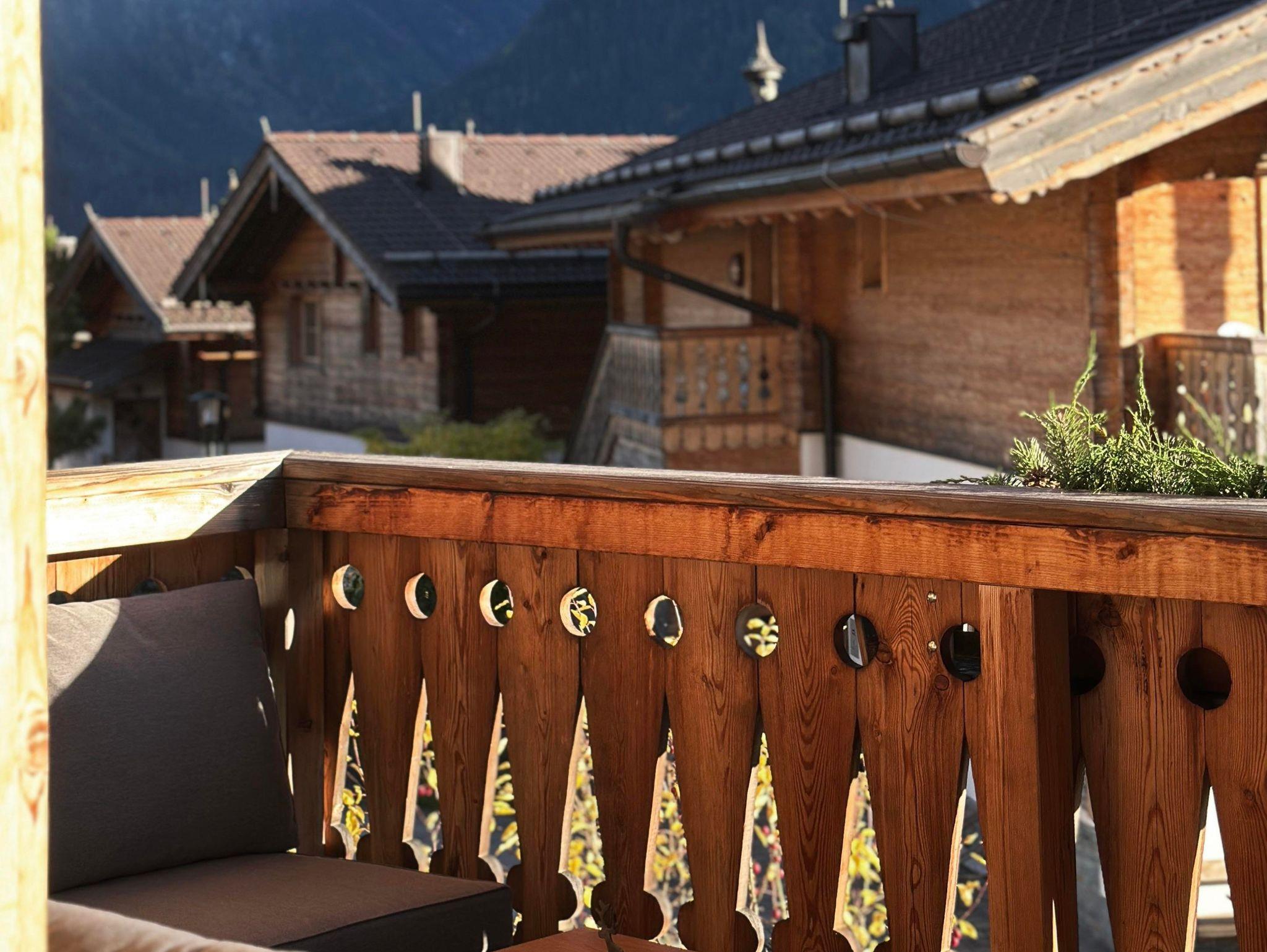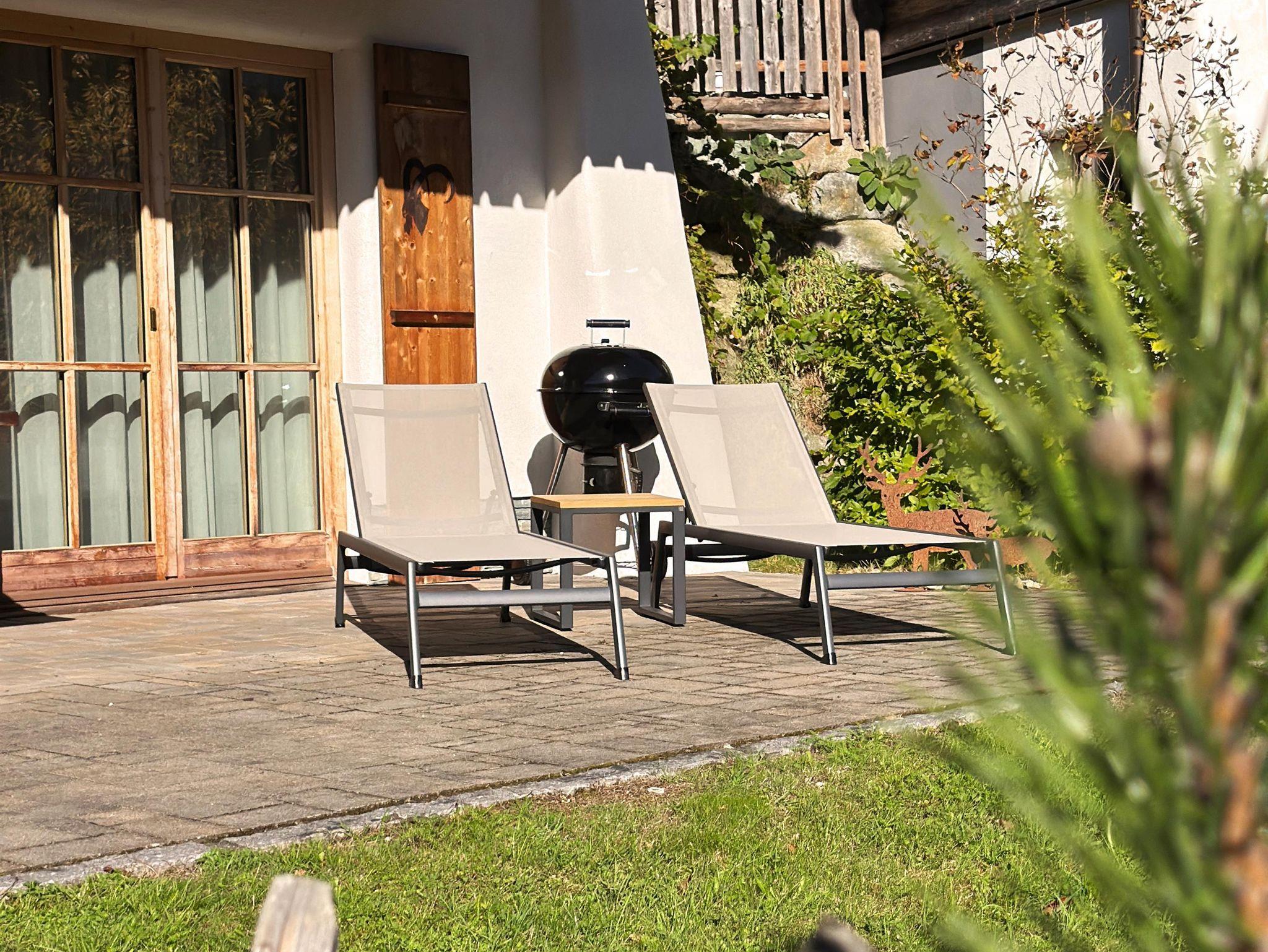 Außen: Südbalkon, Terrasse, Garten mit Lounge, Esstisch, Sonnenliegen, Grill, Ski- und Fahrradraum.