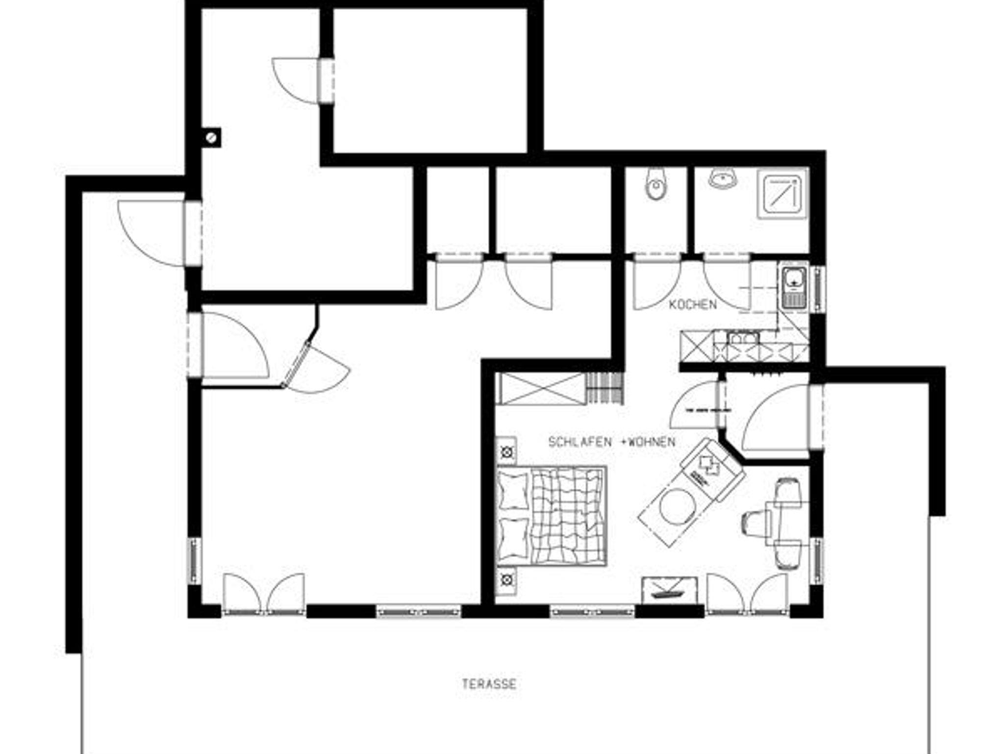 Appartement 4: 2-Zimmer-Wohnung 38 m2, im Erdgeschoss, modern und gemütlich eingerichtet: Eingang. Wohn-/Schlafzimmer mit Esstisch, Sat-TV. Ausgang zum Garten. Kochnische. Dusche, sep. WC. Grosse Terrasse 20 m2, Gartensitzplatz. Gartengrill.
