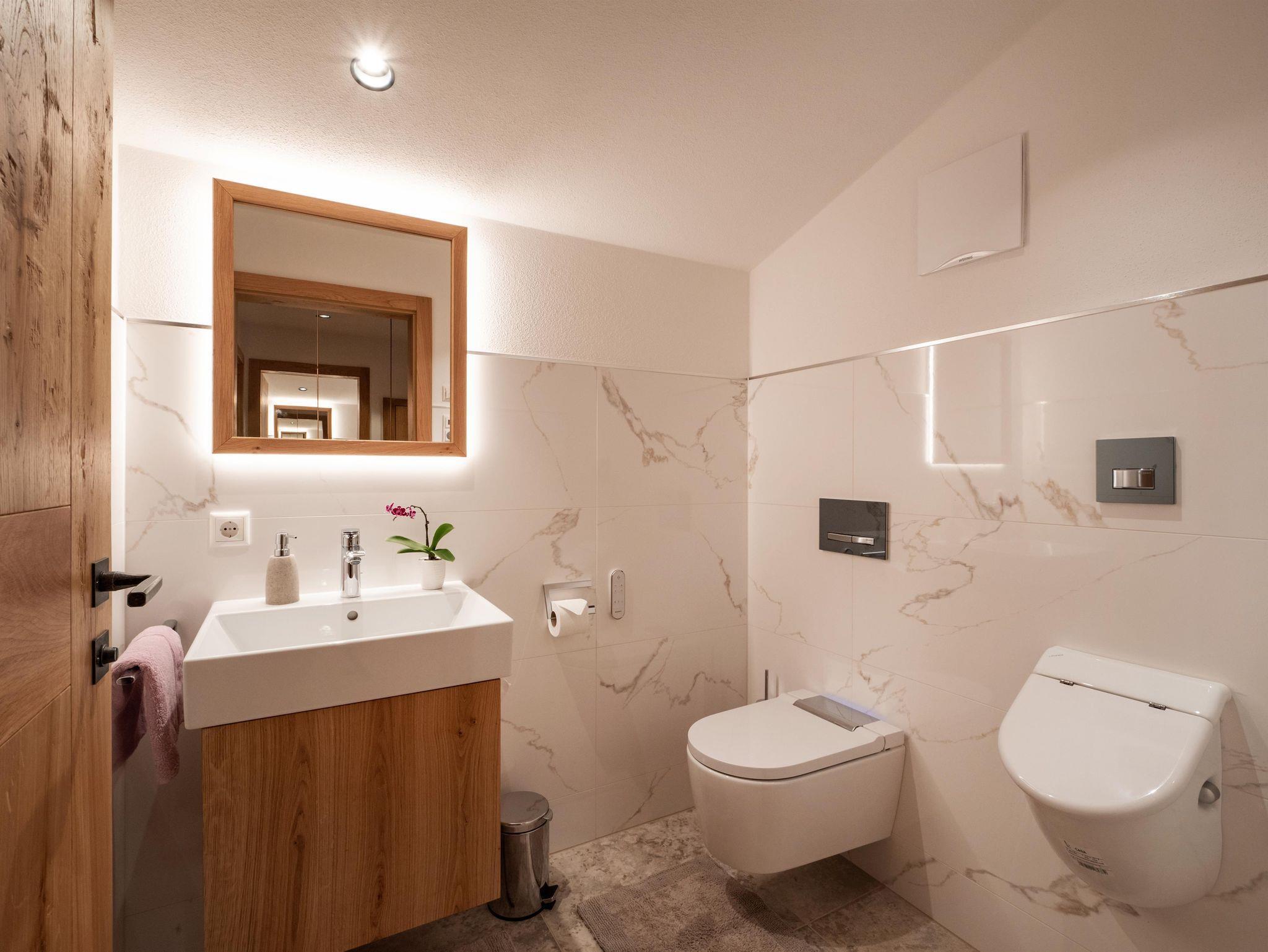 Badezimmer mit Regendusche und Zugang zur Zirbensauna und Infrarot-Rückenstrahler