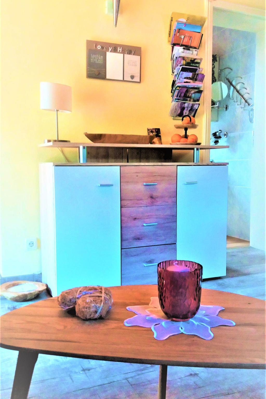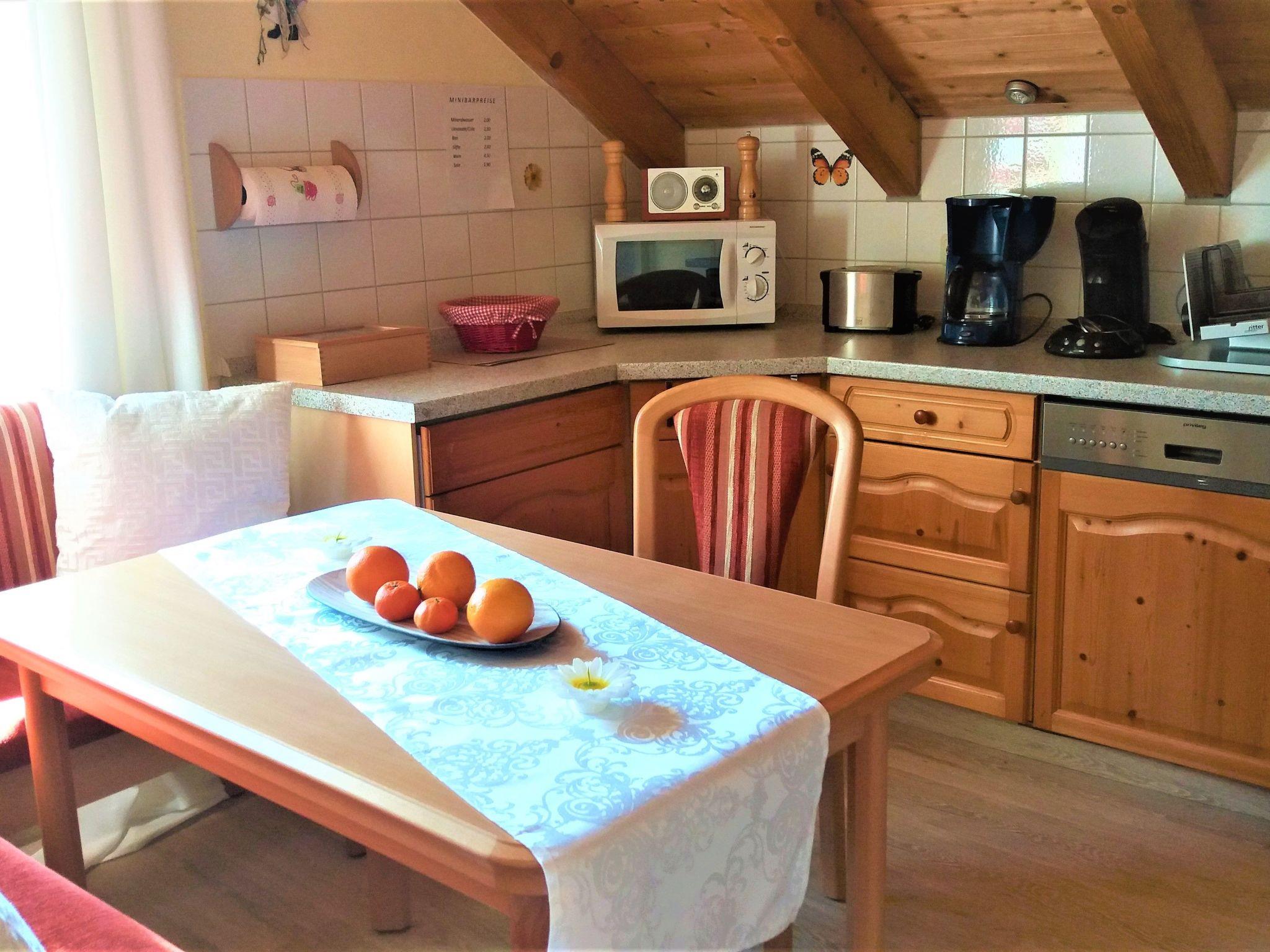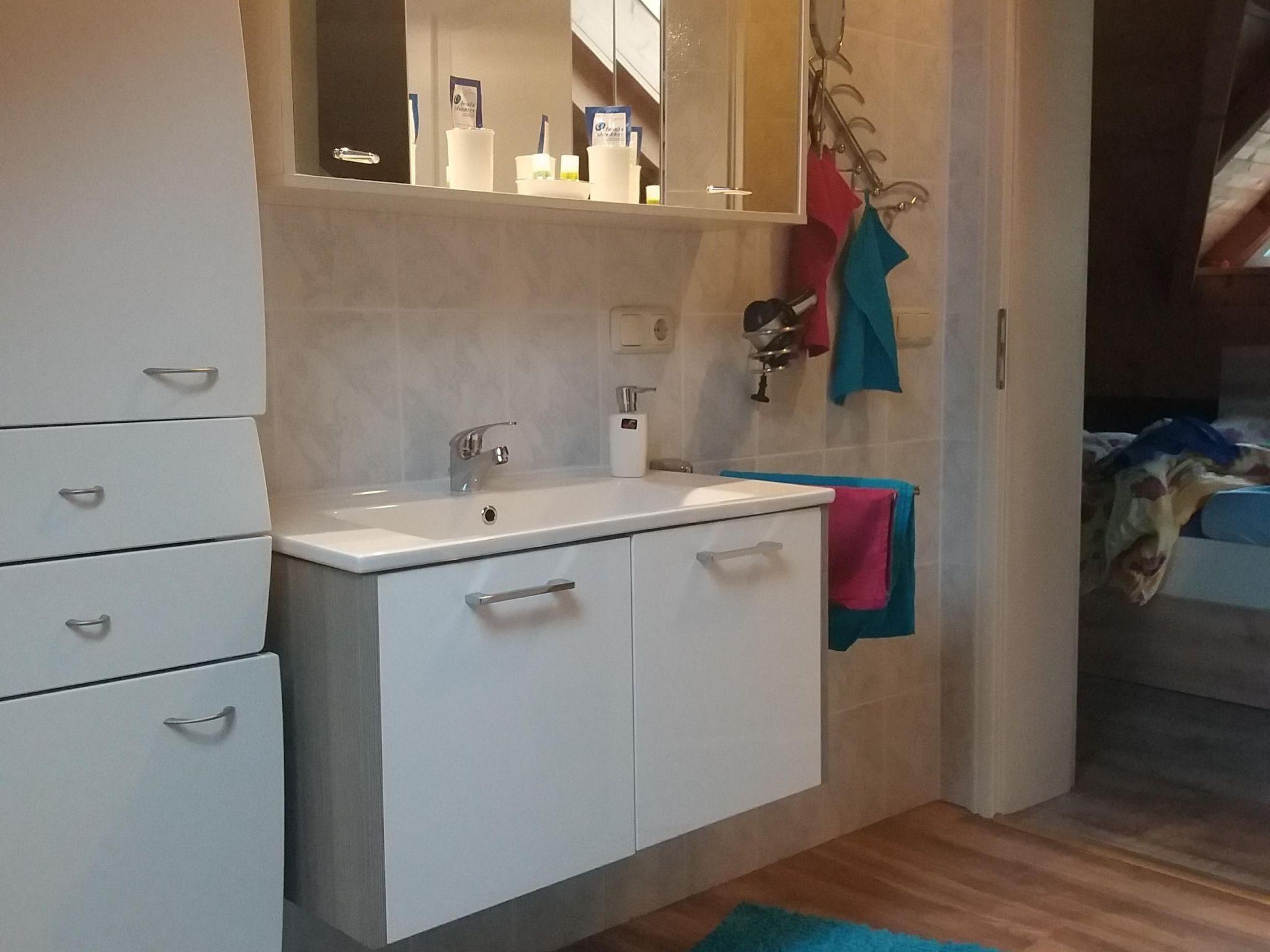 You reach your holiday flat via a separate entrance. The flat has high-quality, modern furnishings and many accessories for a comfortable holiday. The holiday flat has underfloor heating in all rooms. The living space of 38 square metres is divided into a living room and bedroom, a state-of-the-art kitchen with dining area and a bright, spacious bathroom. In the living and sleeping area, you can sleep in a double bed with a comfortable entrance height. In front of the bed is a large, fully mirrored sliding-door wardrobe where you can store your luggage to save space. Next to the wardrobe is a large flat-screen TV (1.19 m screen diagonal) so you can also enjoy a cosy evening from the comfort of your bed or the couch. The adjoining living area has been stylishly decorated with new furniture. . Warm colours and lots of wood create a cosy ambience. In the separate, spacious kitchen, your self-catering will be a pleasure: a latest-generation convection cooker with an 80cm touch ceramic hob lets you conjure up delicious meals. There is also a dishwasher, a microwave and small electrical appliances such as a coffee machine, a Senseo coffee pod machine, a toaster and a kettle, as well as all the necessary cooking utensils and crockery. Take a seat in the dining area on a corner bench right by the window and enjoy the marvellous view of the surrounding mountains and the Five Fingers (viewing platform at 2100 m above sea level) as well as the Krippenstein while you eat. The giant ice cave is also located here. The separate light-flooded shower room with window is modern and newly designed. In addition to a WC and wash hand basin, it is equipped with many cupboards and shelves.