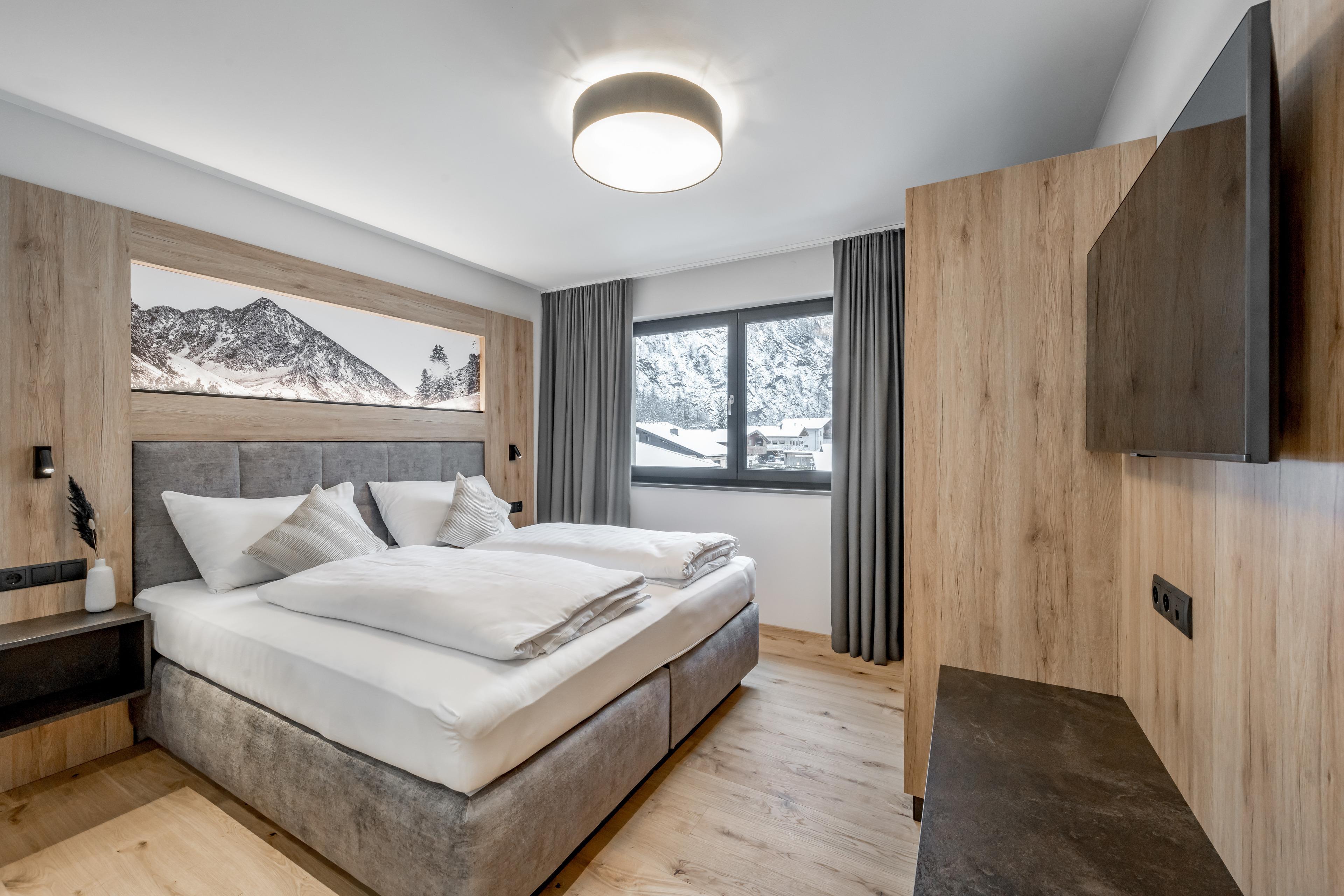 Unsere Apartments ? FIVE in Oetz im Ötztal befindet sich im zweiten Obergeschoß und ist einfach über den Personenaufzug zu erreichen. Es begeistert mit sonnigem, offenem Wohn-Ess-Kochbereich und voll ausgestatteter Küche inkl. ausziehbarer Couch und einer direkt an den Wohnbereich angrenzender Zirbenholz-Sauna mit integriertem Infrarotstrahler. Das Apartment bietet zwei Schlafzimmer, eines davon ist ausgestattet mit einem Doppel-Boxspringbett, das zweite mit einem Doppel-Boxspringbett und zusätzlich einem Einzelbett. Die Schlafzimmer verfügen jeweils über ein großzügiges, modernes Badezimmer mit Dusche & WC.