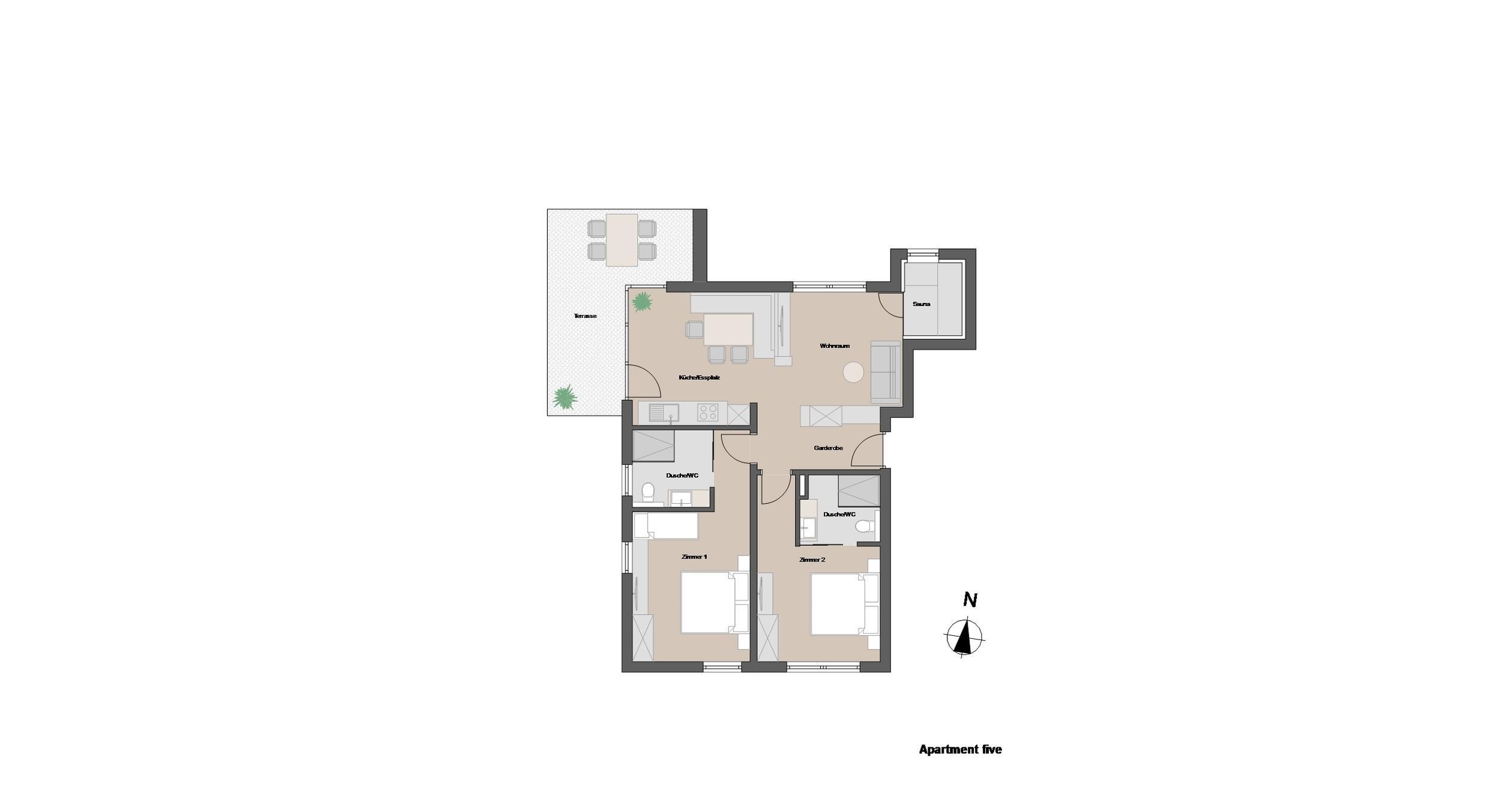 Im Apartment ? FIVE entspannen Sie auf einer nach Südwesten ausgerichteten, voll möblierten und überdachten Terrasse.