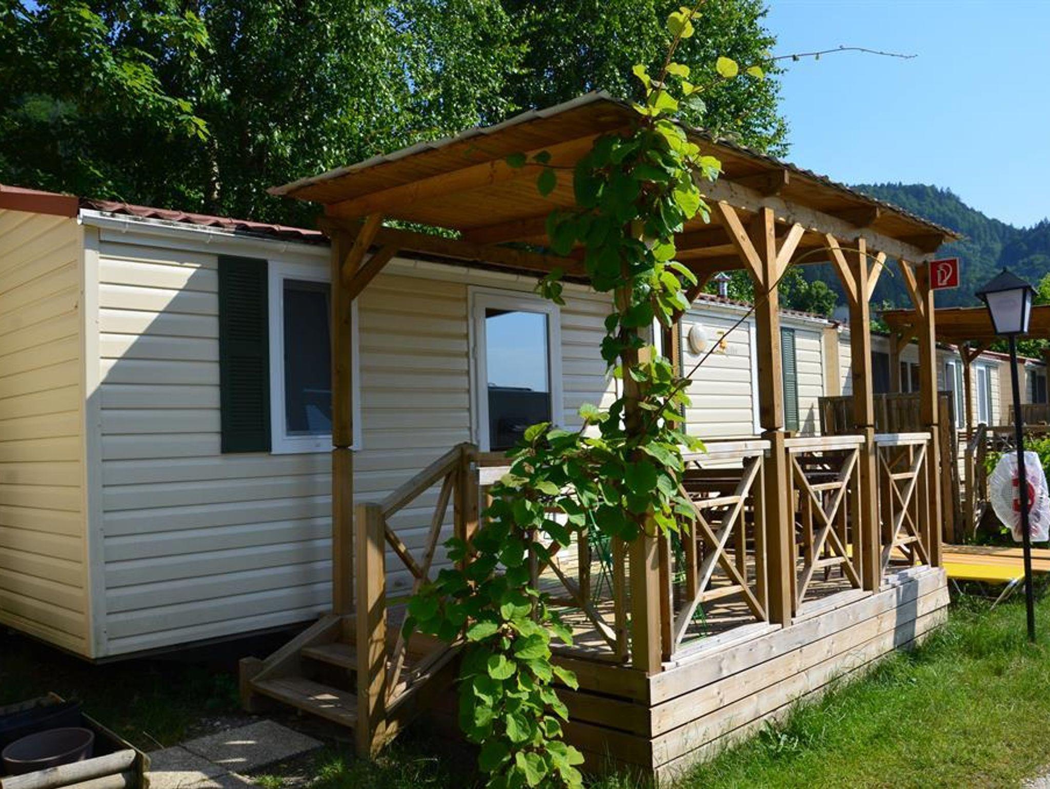 Ausstattung der Mobil Heime: Ein Schlafzimmer mit Ehebett. Ein separates Schlafzimmer für 2 bis 3 Kinder (Personen). Badezimmer mit Dusche und Waschbecken. WC. Im Wohnzimmer ausziehbares Doppelbett für 2 weitere Personen Maximalbelegung 6 - 7 Personen, je nach Typ. Mikrowelle, Gasherd, Kühlschrank, Dunstabzug, Abwasch, Geschirrspüler, Sitzecke, Klimaanlage, TV, Überdachte Terrasse mit Tisch und Stühle. Inkl. Bettwäsche, Geschirr und Porzellan. Wellness Eintritt, Liegestüle und WLan inklusive