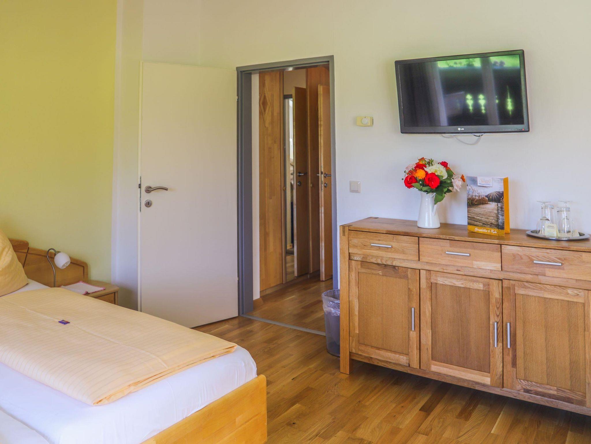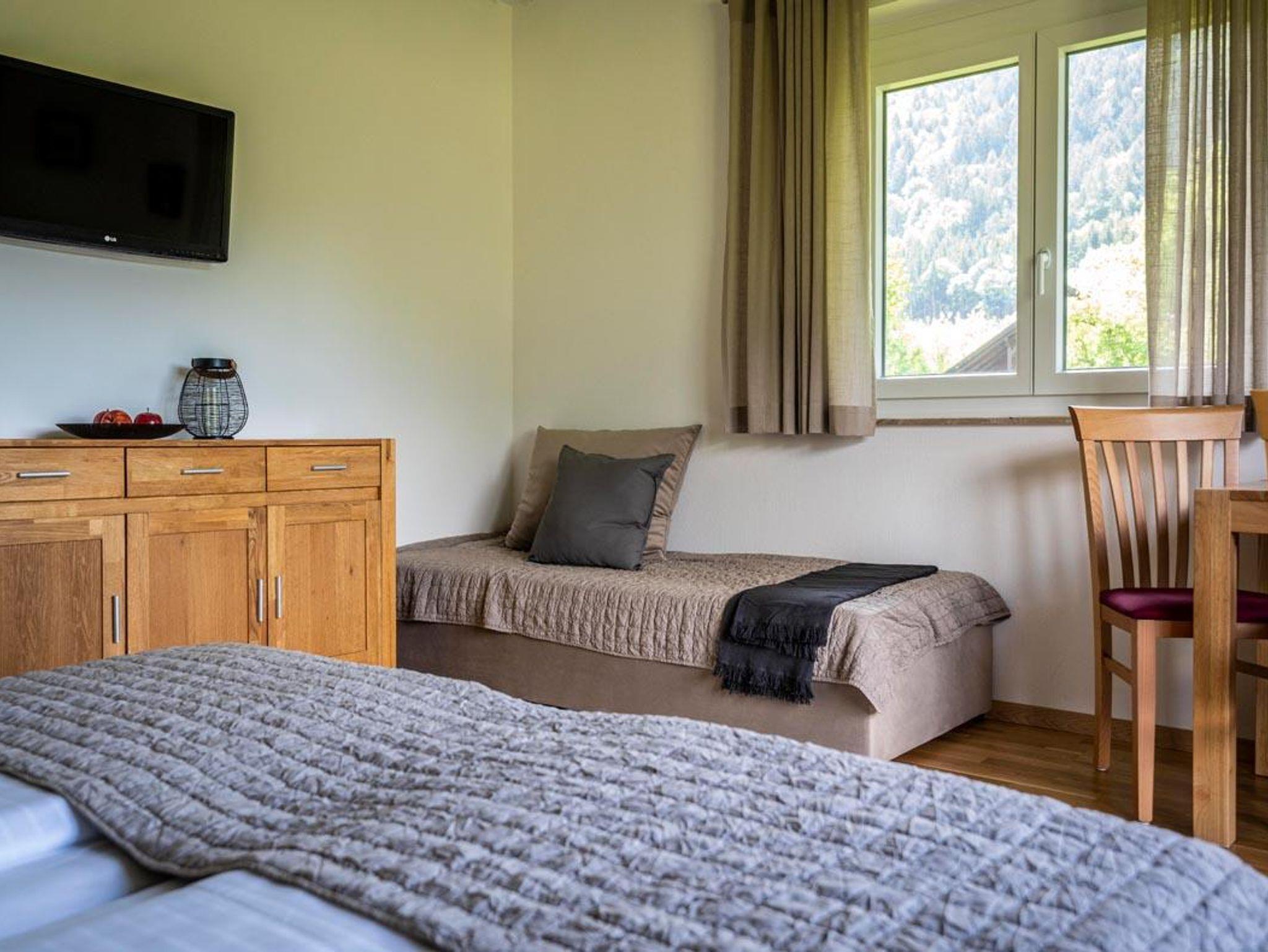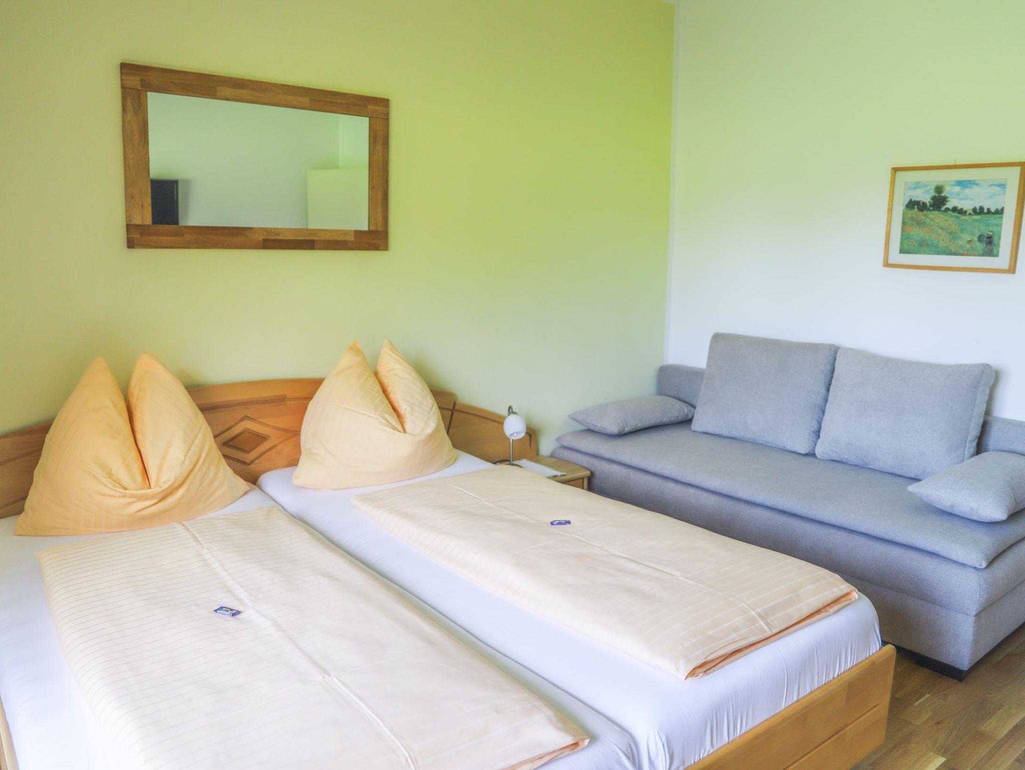 • Komfortzimmer mit Doppelbett und einem zusätzlichem Bett, Flat-TV, WLAN bzw. Wifi, Tresor