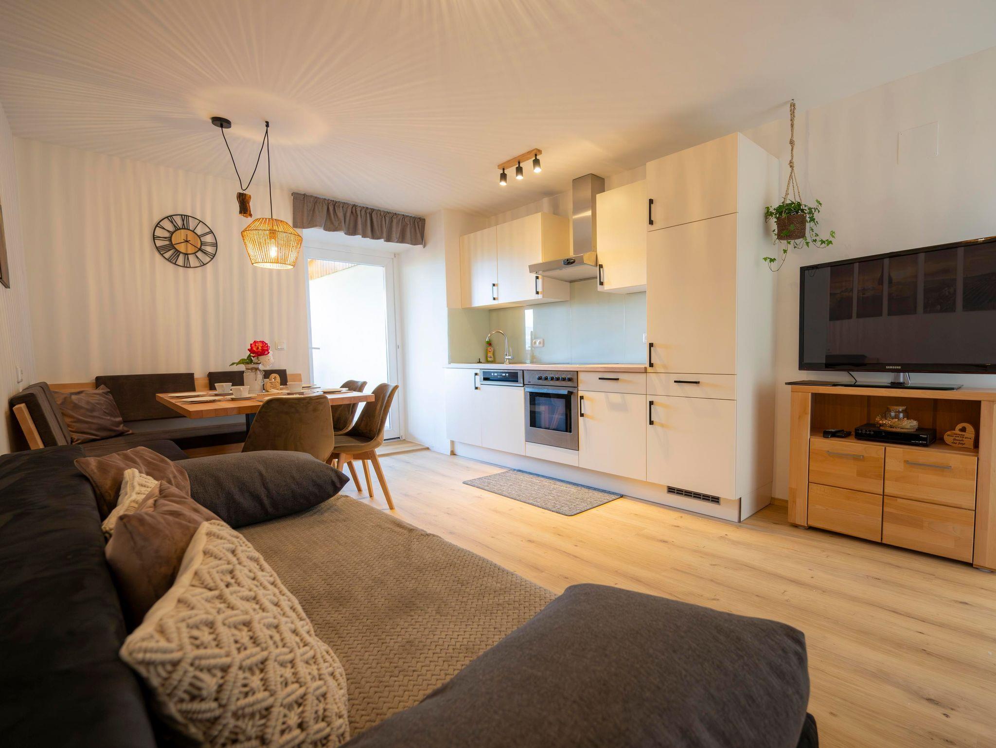 Diese Ferienwohnung (ca.45m2) für 2 Personen verfügt über ein Schlafzimmer mit Couch, Badezimmer,Wc, Küche, Esszimmer und einer Terasse mit herrlichen Blick übers Pöllauer Tal.