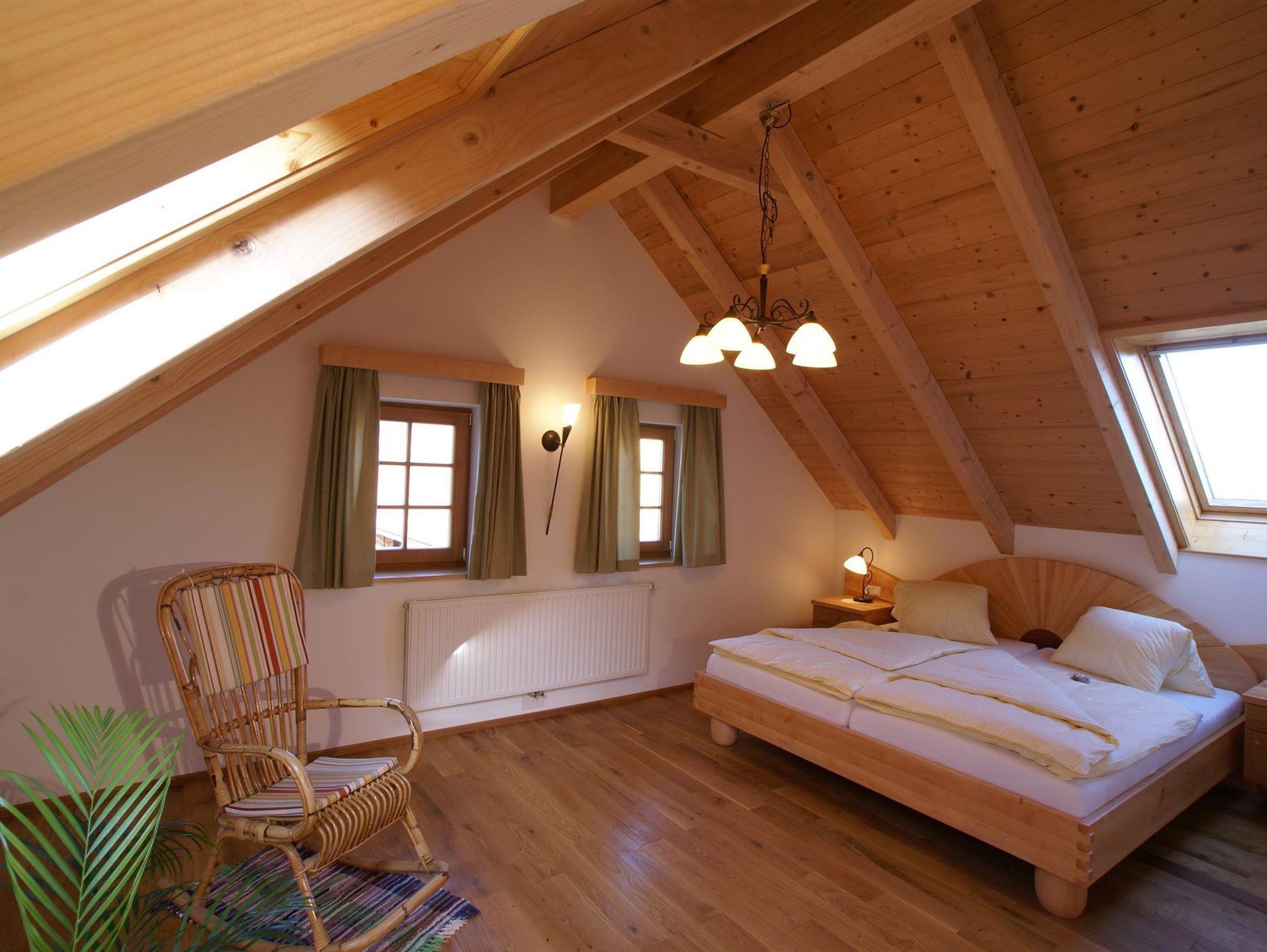 Großes Schlafzimmer mit Erlensonnenbett 200 x 200. Zweites Schlafzimmer mit Einzelbetten auch als Doppelbett, mit Bettwäsche.