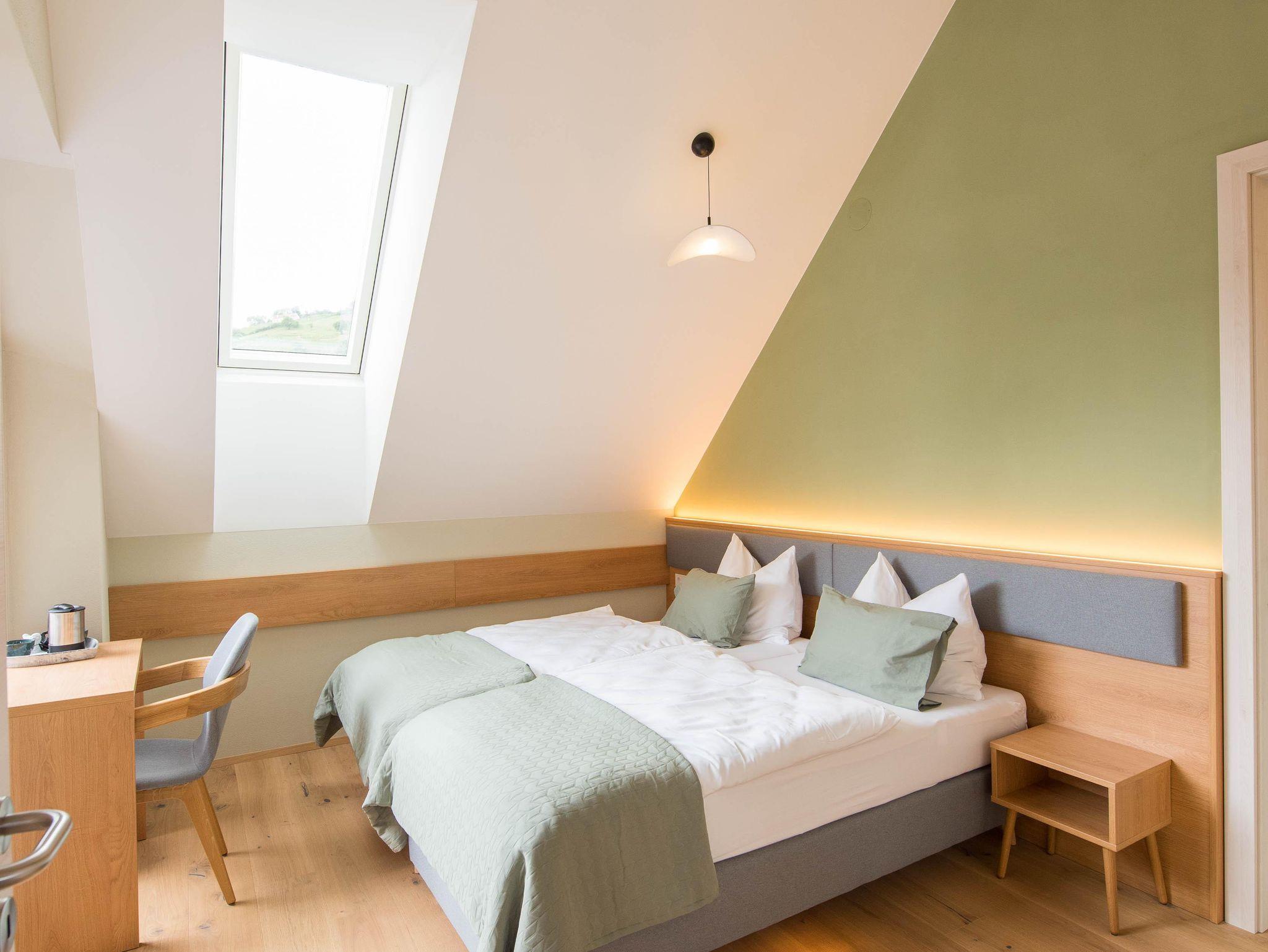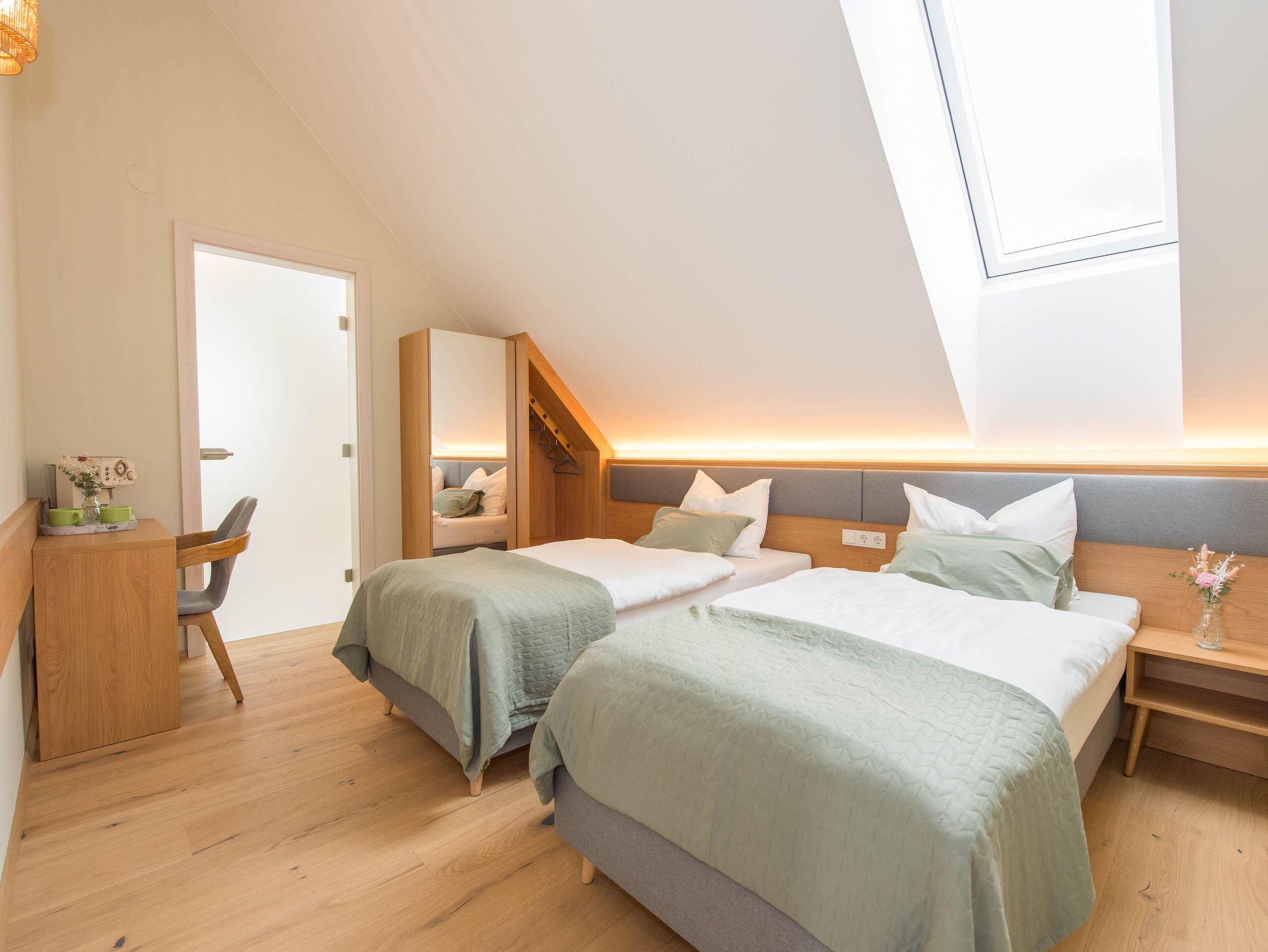 Das Doppelzimmer im Dachgeschoss des Neubaus auf unserem Bauernhof vereint modernen Komfort mit ländlichem Charme. Es ist frisch und zeitgemäß gestaltet, bietet wahlweise ein Doppelbett oder zwei Einzelbetten und lädt zum Wohlfühlen ein. Durch seine Lage im Dachgeschoss genießen Gäste eine besondere Atmosphäre mit schönen Ausblicken auf die umgebende Natur.