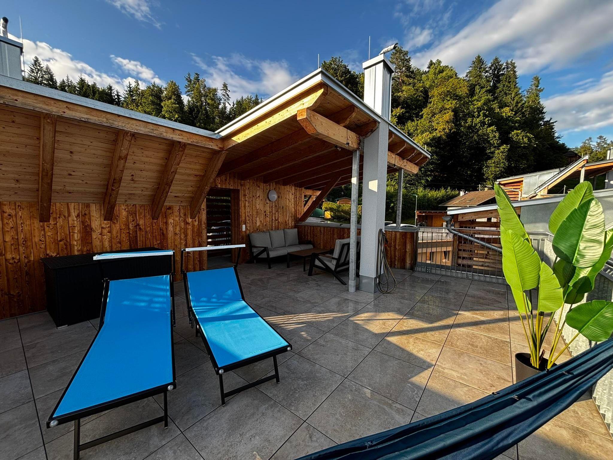Gemütliche Holz-Lodges verbunden mit moderner, hochwertiger Ausstattung; ruhig mitten im Grünen und gleichzeitig seid ihr in wenigen Minuten direkt am Wörthersee. Auf 60m² Wohnfläche erwartet euch ein lichtdurchfluteter Wohn-Essbereich mit moderner, voll ausgestatteter Küche – ideal für gemeinsame Kochabende mit Familie oder Freunden. Die Küche lässt keine Wünsche offen. Zwei gemütliche Schlafzimmer – eines mit Doppelbett, das andere mit einem praktischen Hochbett – sowie eine bequeme Schlafcouch im Wohnzimmer bieten Platz für bis zu sechs Personen. An sonnigen Tagen genießt ihr eure Mahlzeiten auf eurer eigenen Terrasse mit kleinem Garten. Und wenn der Tag langsam ausklingt, wartet schon ein besonderes Highlight auf euch: die 50 qm große, private Dachterrasse mit gemütlichen Loungemöbeln. Hier seid ihr ungestört, vor Blicken geschützt – und der Sternenhimmel gehört ganz euch.