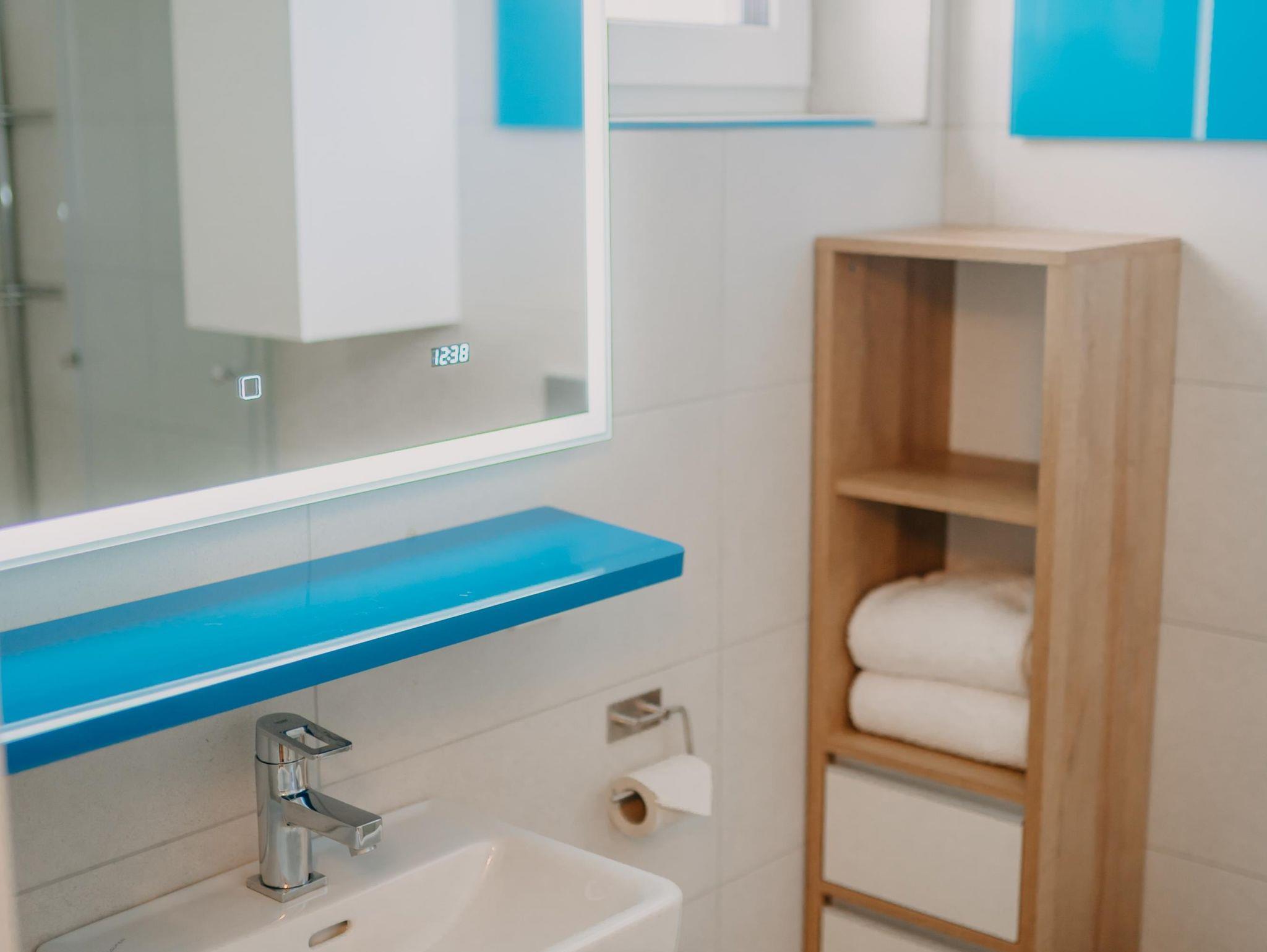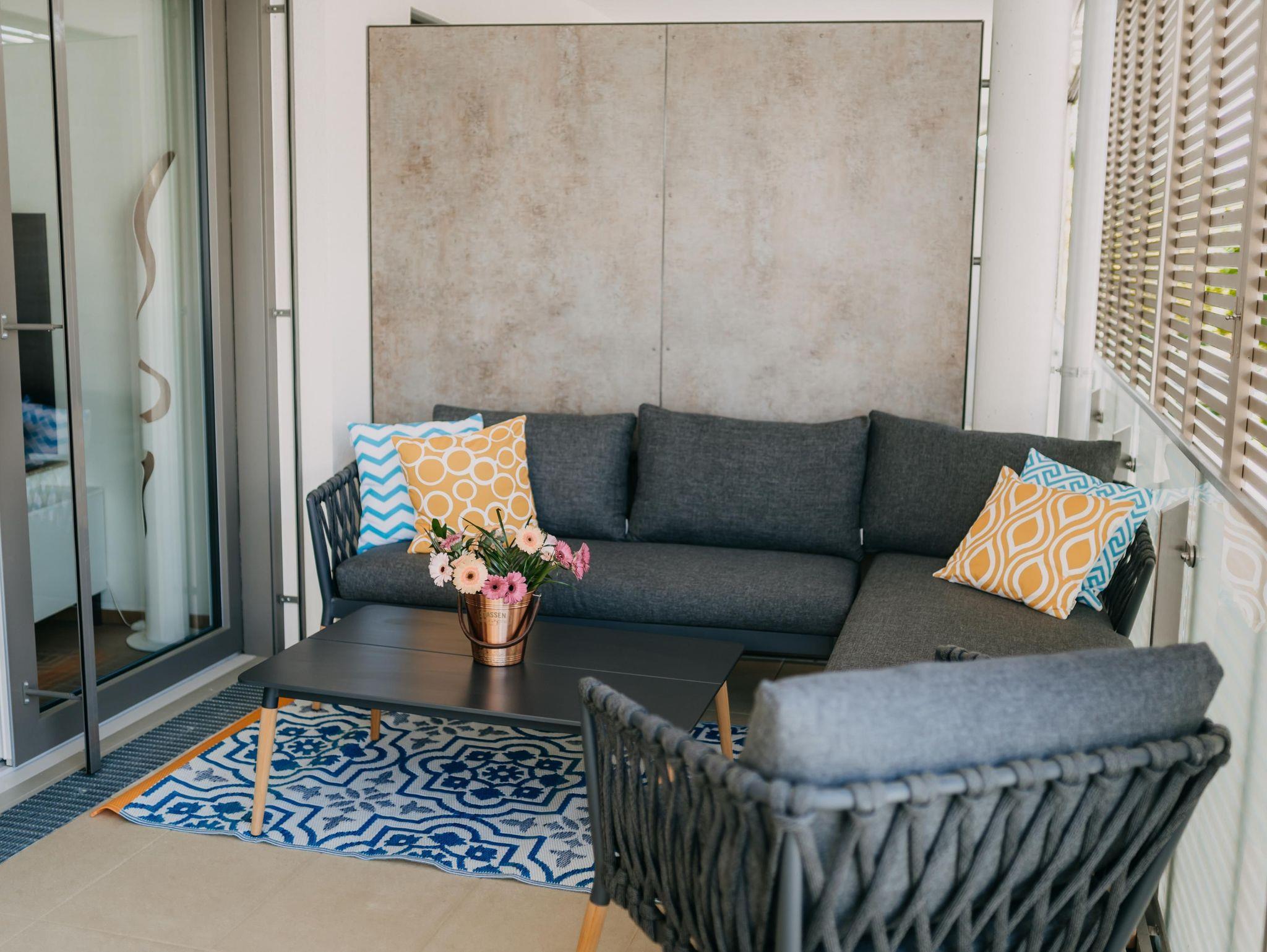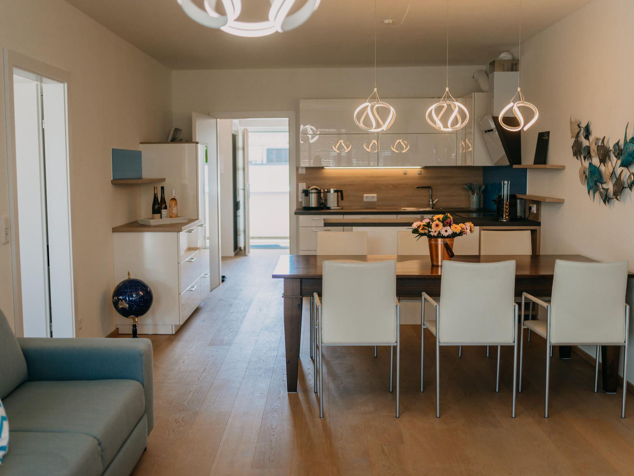 Das Apartment verfügt über 2 Schlafzimmer mit einem Doppelbett und einem extra großen Etagenbett (140x200). Im Wohnzimmer dürfen 2 weitere Personen auf der Schlafcouch schlafen. Die Wohnung ist für bis zu 6 Personen - und somit ideal für Familien geeignet. Des weiteren verfügt das Apartment über eine voll ausgestattete Küche mit Nespresso Kaffeemaschine, Backofen und Spülmaschine. Ein absolutes Highlight ist der überdachte Außenbereich der Wohnung. Der 24 qm große Balkon bietet genügend Platz für erholsame Abende im Freien.