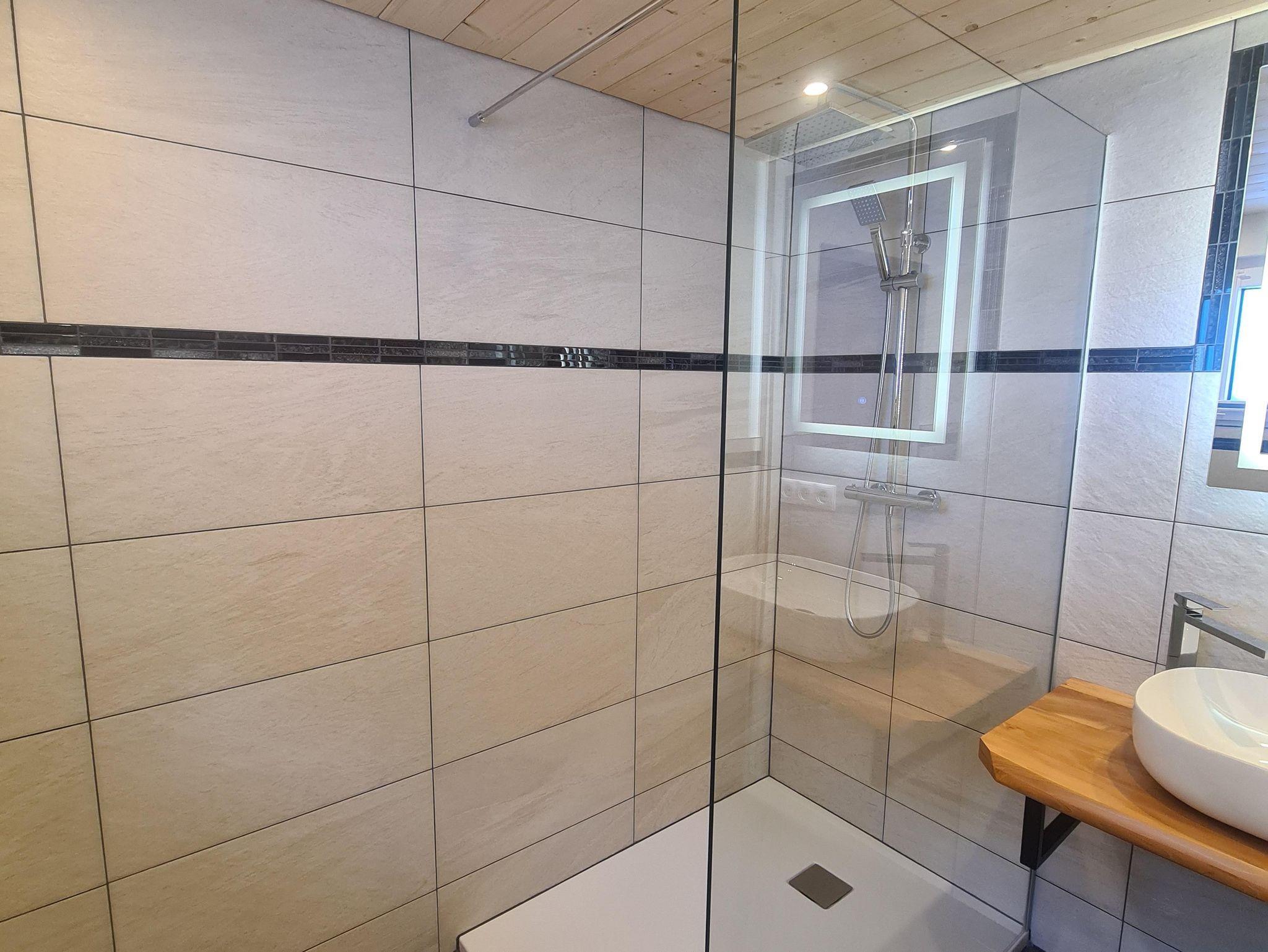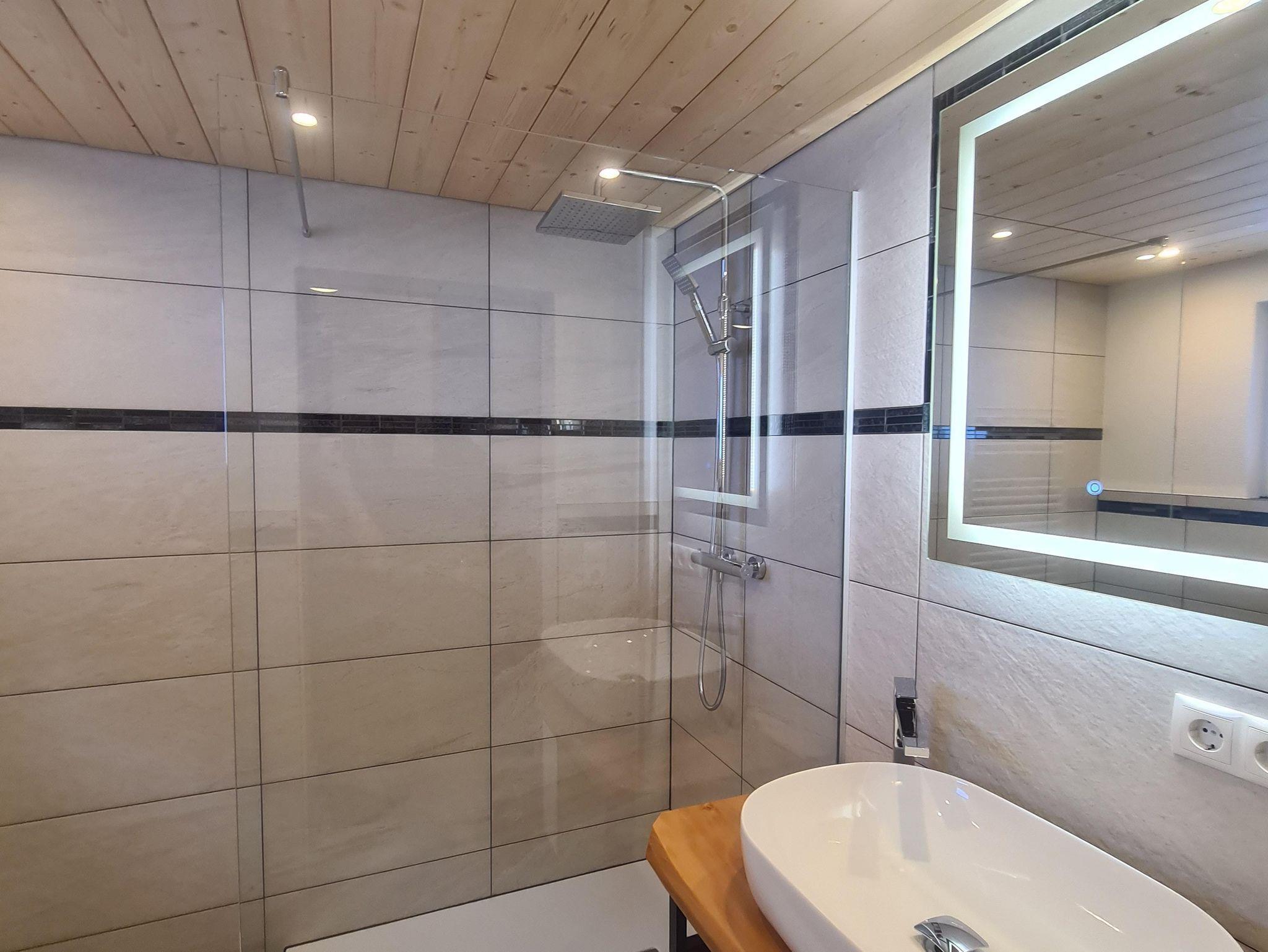 5 Schlafzimmer mit Doppelbetten und TV, 1 Badezimmer mit Dusche & WC,1 Badezimmer mit Dusche. 2 separate WC (in jedem Stockwerk eines). Skiraum mit Skischutrockner ist vorhanden.