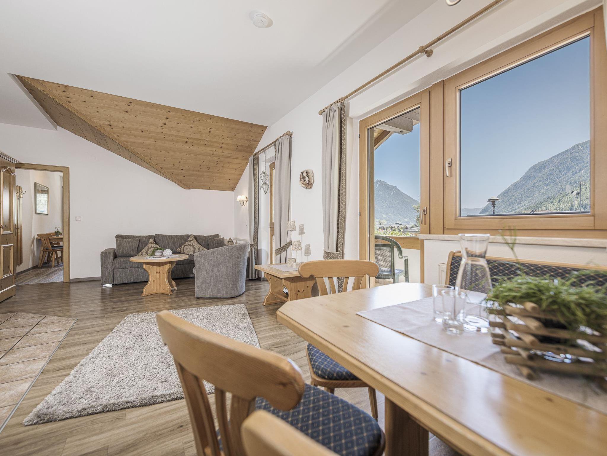 Ein Schlafzimmer mit Doppelbett, ein Schlafzimmer mit Einzelbett, zwei Badezimmer mit WC, Vorraum, Wohnraum mit ausziehbarer Doppelcouch und Balkon. Genießen Sie dazu noch den unvergleichlich schönen Blick auf die umliegenden Berge mit Zwölferkopf und Karwendel-Bergbahn.