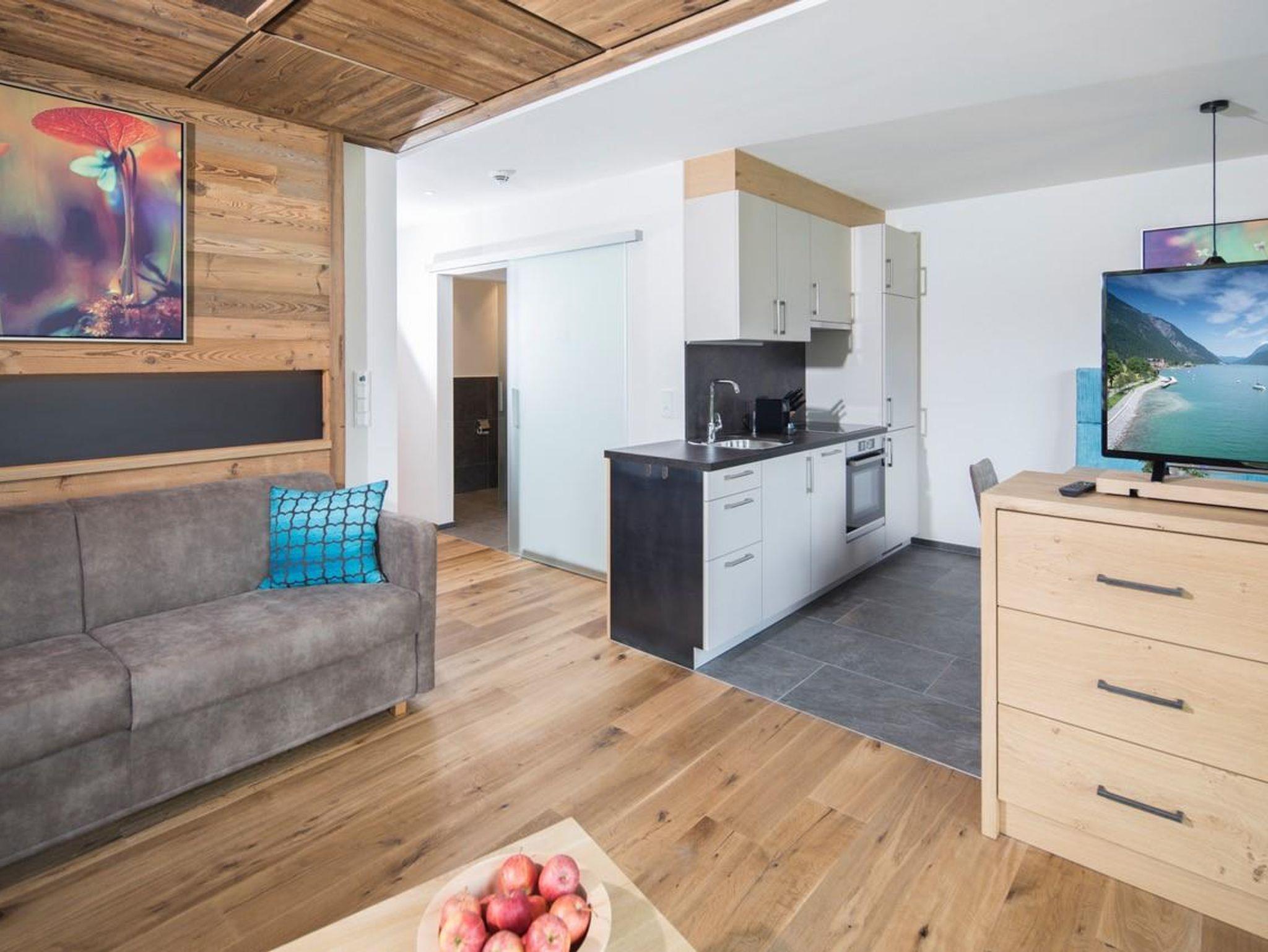 Hochwertige Naturmaterialien verleihen diesem Appartement ein besonderes Flair. Eine Einrichtung in edlem Holzdesign und hochwertigen Naturmaterialien in mitten der beeindruckenden Bergwelt bereichern diese Wohlfühl-Atmosphäre