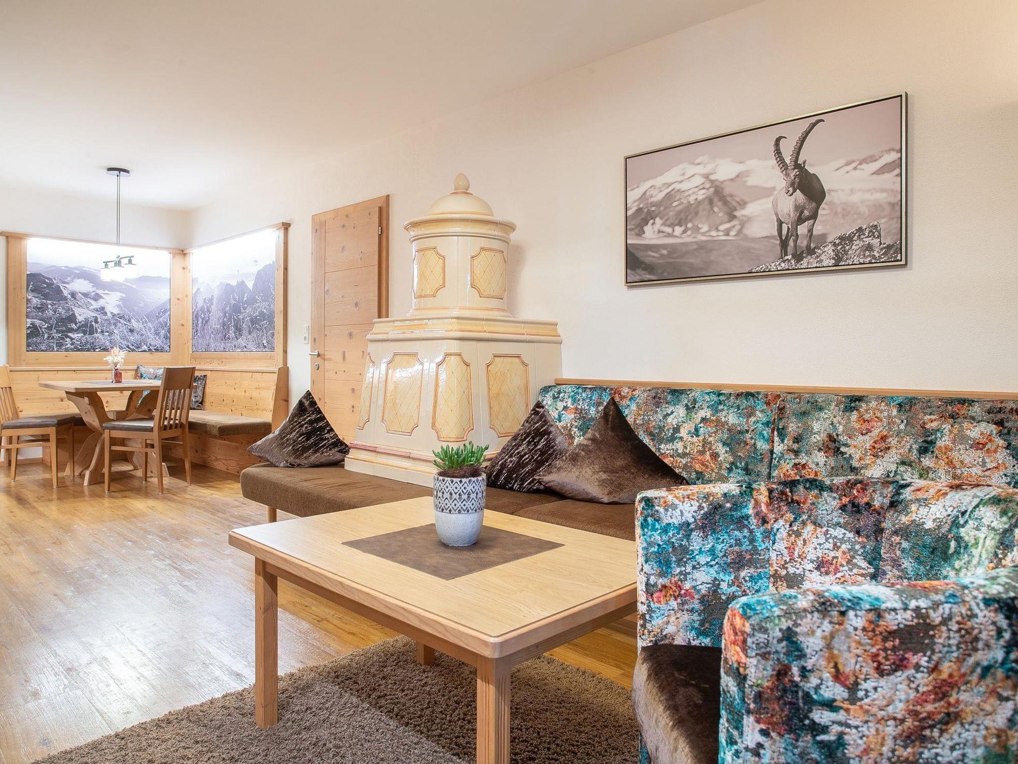 • Wohnraum mit Kachelofen und Liegebank zum Kuscheln, Doppel-Ausziehcouch, Schreibtisch