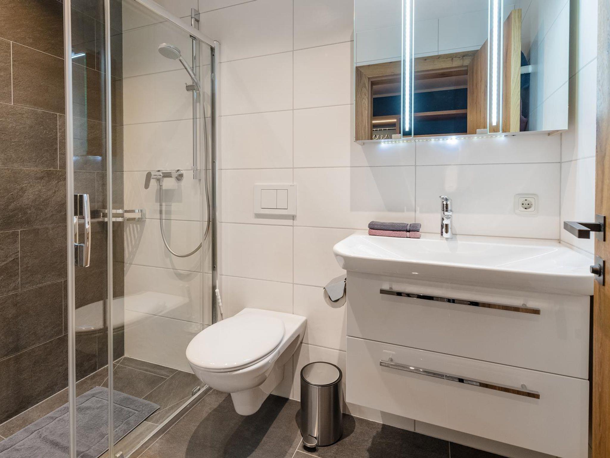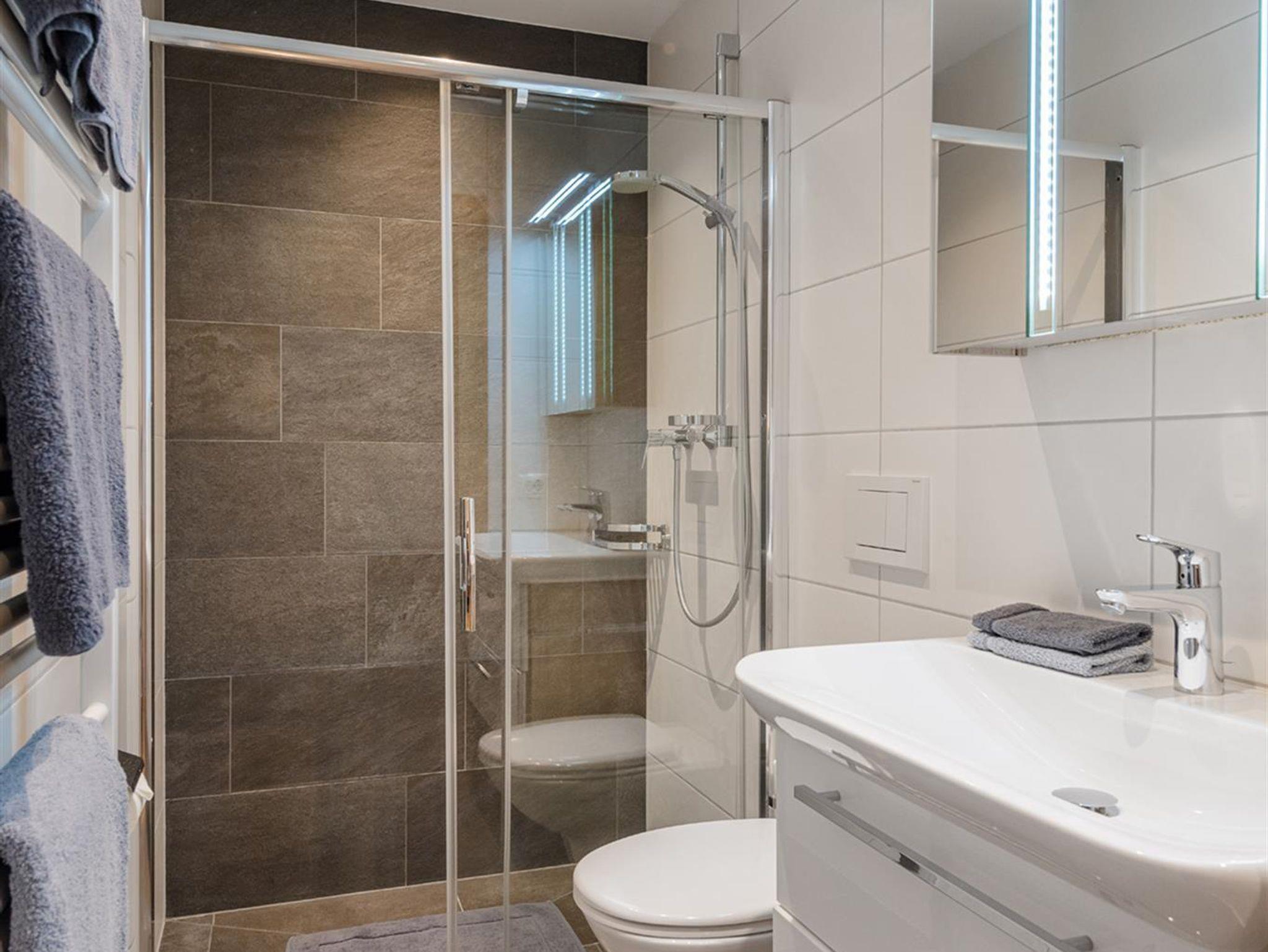 • modernes Badezimmer mit barrierefreier Dusche und WC (Fön, Kosmetikspiegel, Radio)