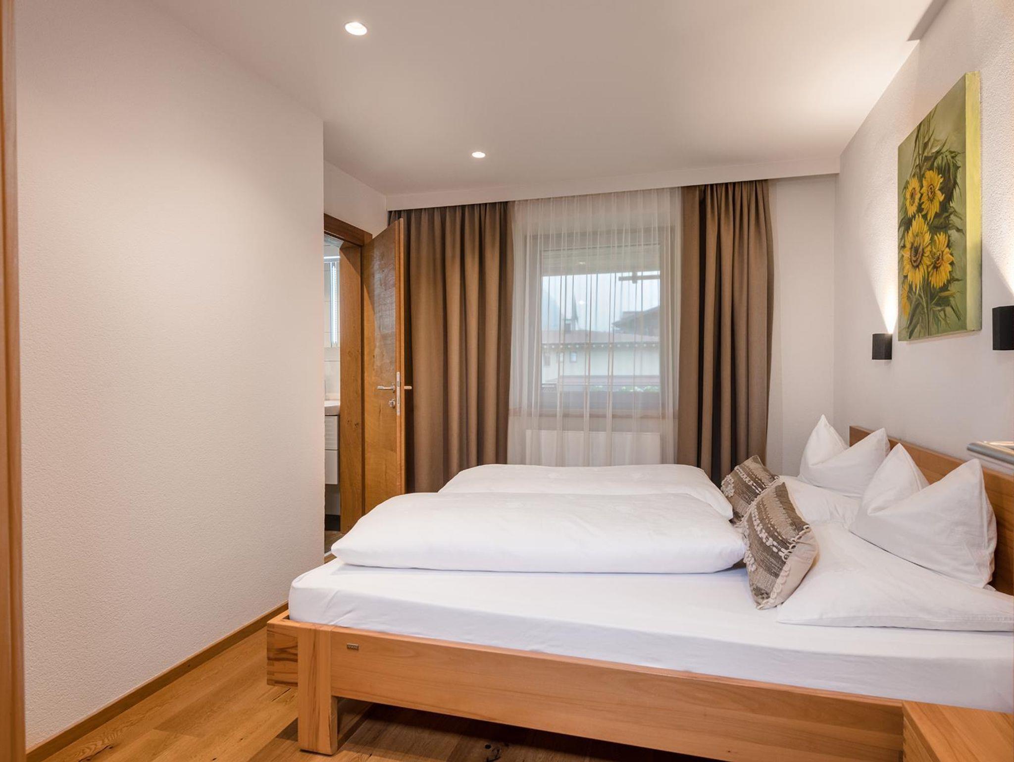 1 Schlafzimmer mit Doppelbett, Eichenholzboden und Verdunkelungsvorhängen