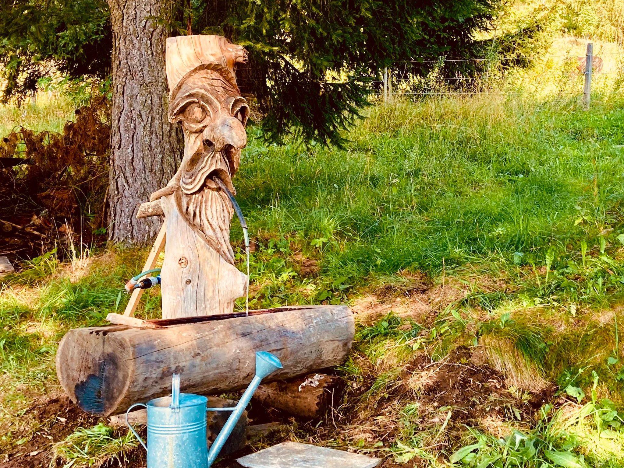 Eine weitere Besonderheit, unserer ruhigen Rückzugsoase, ist der selbst geschnitzte Holz-Brunnen Berg-Fried mit erstklassiger Trinkwasserqualität aus der eigenen Berg-Quelle.