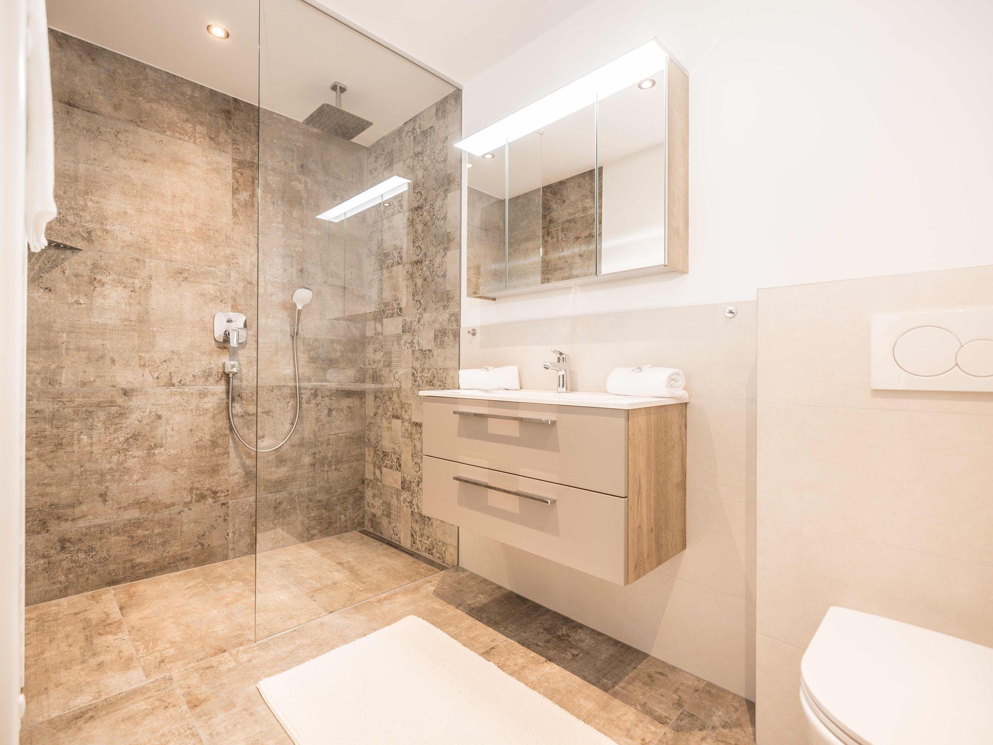 Das moderne Badezimmer verfügt über eine Regendusche, Waschtisch mit Spiegel, WC, Föhn und Handtücher.