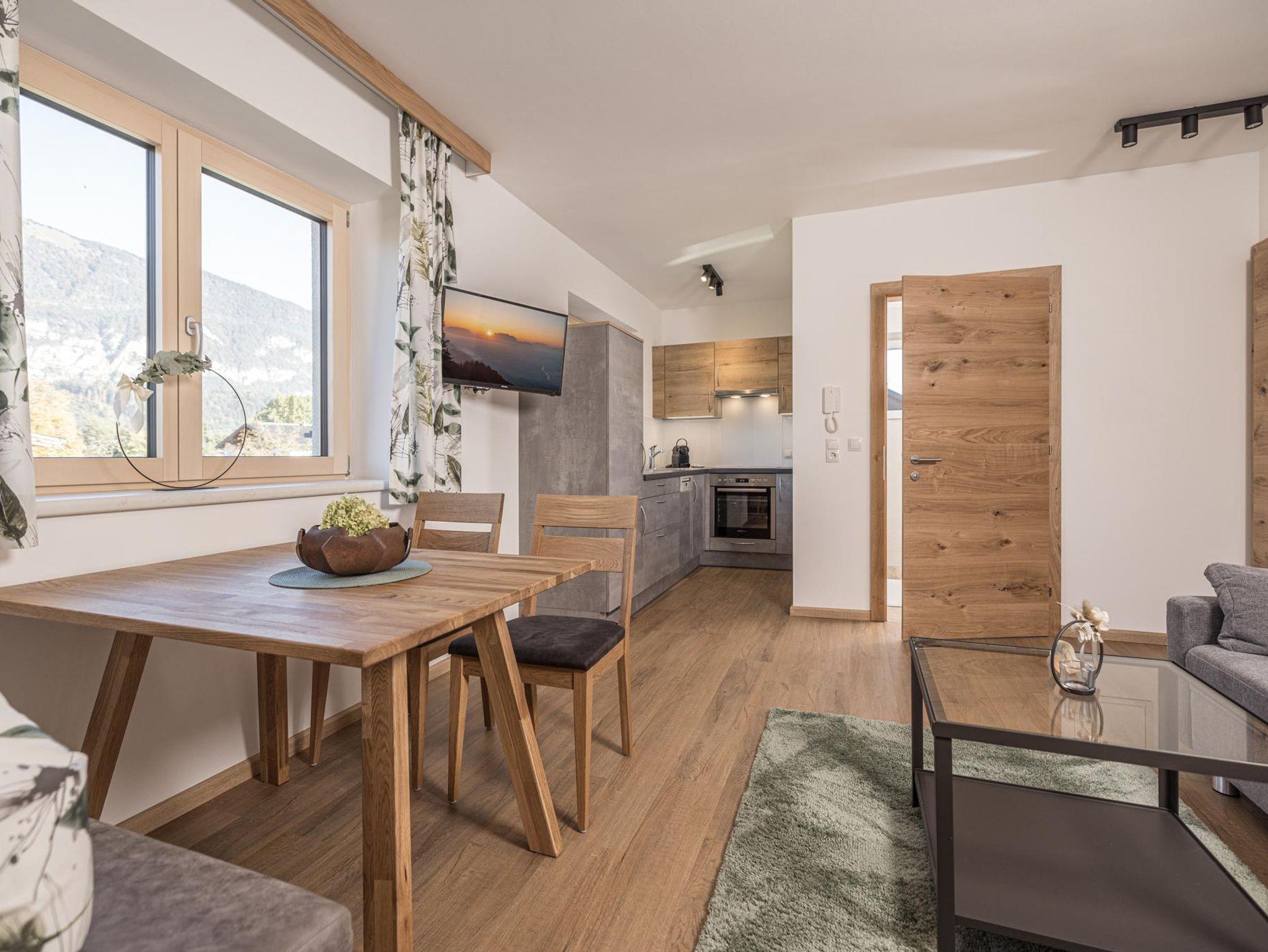 Das Appartement Auszeit befindet sich im 2. Obergeschoss (60m2) und bietet Platz für bis zu vier Personen. Das moderne Appartement mit Blick auf den Rattenberger Schlossberg sowie das Inntal verfügt über zwei getrennte Schlafzimmer mit einem großzügigen Doppelbett sowie einem Stockbett und einem Wohn - Essbereich. Die Küche ist voll ausgestattet: Nespresso Maschine, Wasserkocher, Kühlschrank mit Gefrierfach, Backofen, 4- Platten Cerankochfeld, Geschirrspüler, Kochuntensilien und Geschirrtücher. TV Geräte finden Sie im Wohn - Essbereich wie auch in den Schlafzimmern vor. Ebenfalls bietet das Appartement eine gemütliche Essecke sowie ein Sofa an.