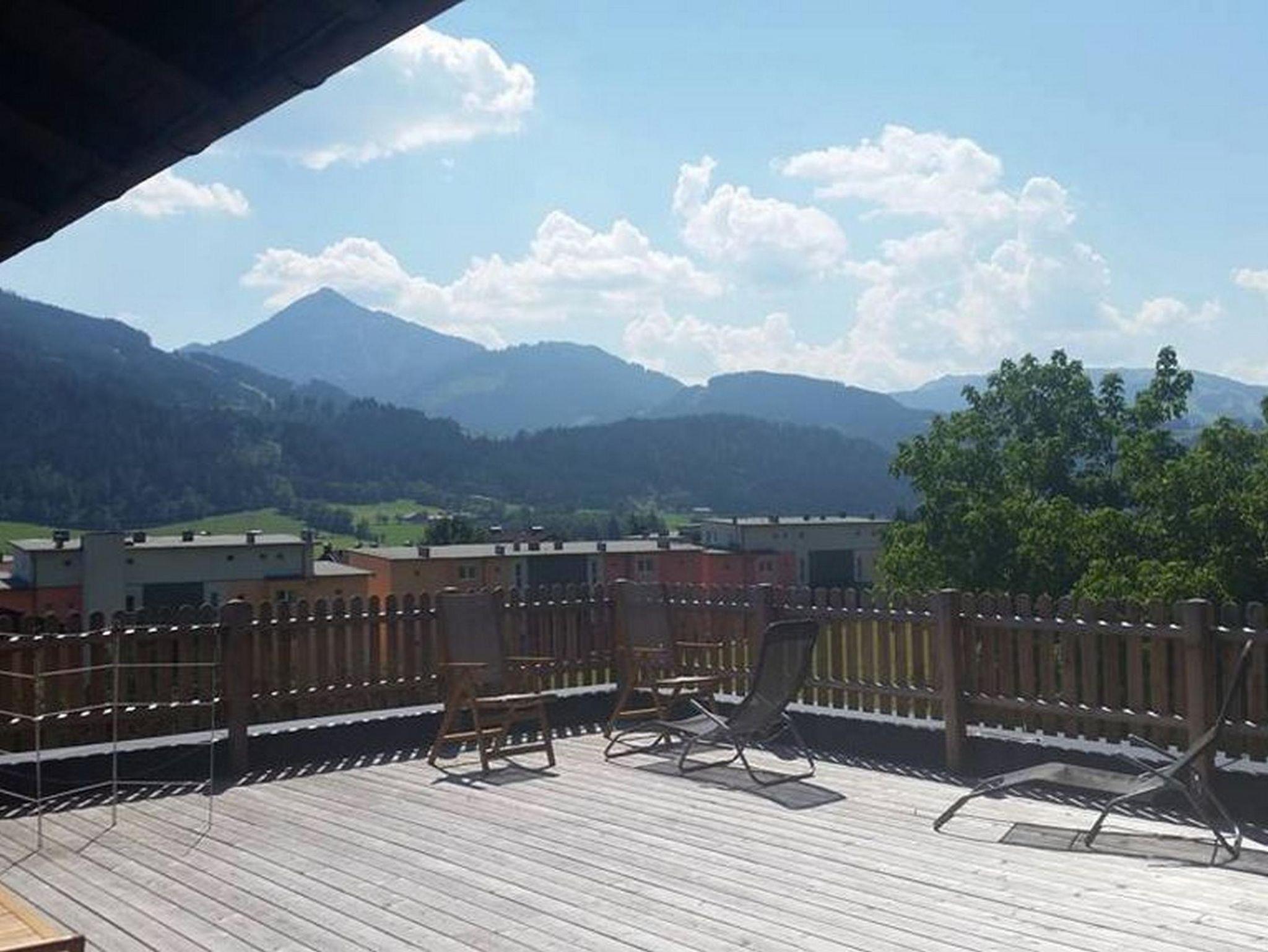 Das kürzlich renovierte Familienzimmer verfügt über einen Balkon und eine Dachterrasse mit herrlichem Blick über das Ennstal bis hin zu den Tauern. Das angrenzende Zimmer verfügt über ein Etagenbett für Kinder.