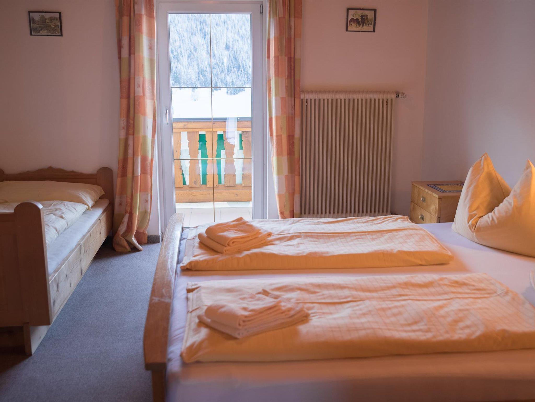 • Drei Dreibettzimmer: Schlafzimmer mit einem Doppelbett und einem Einzelbett sowie Waschbecken und Balkon