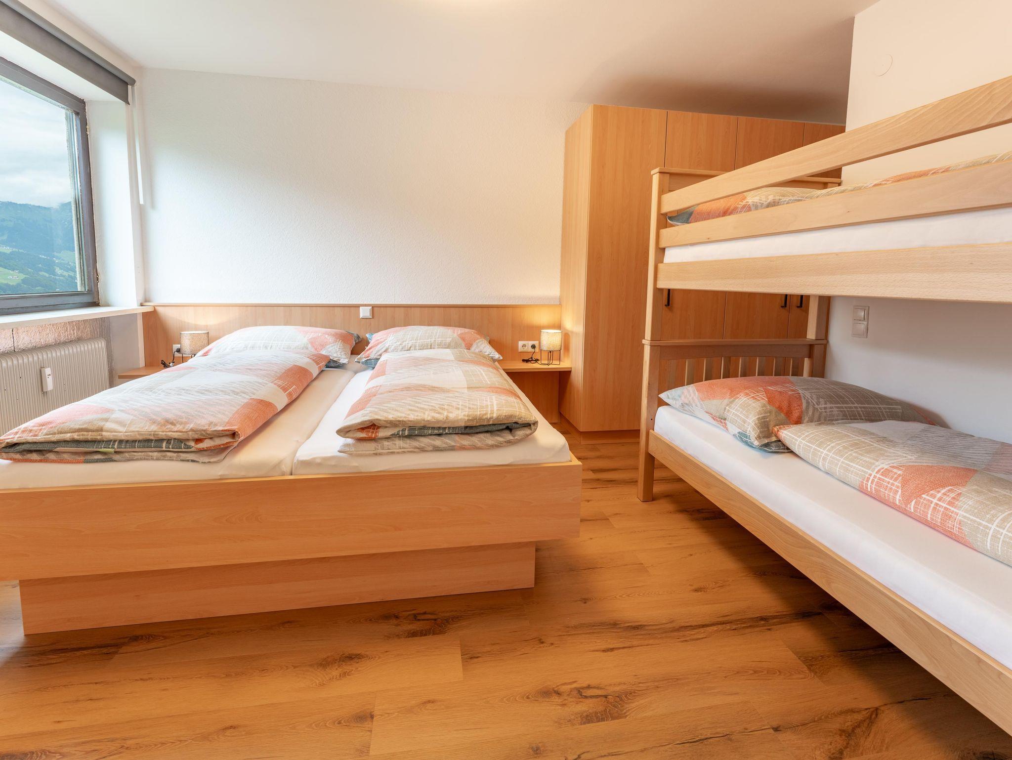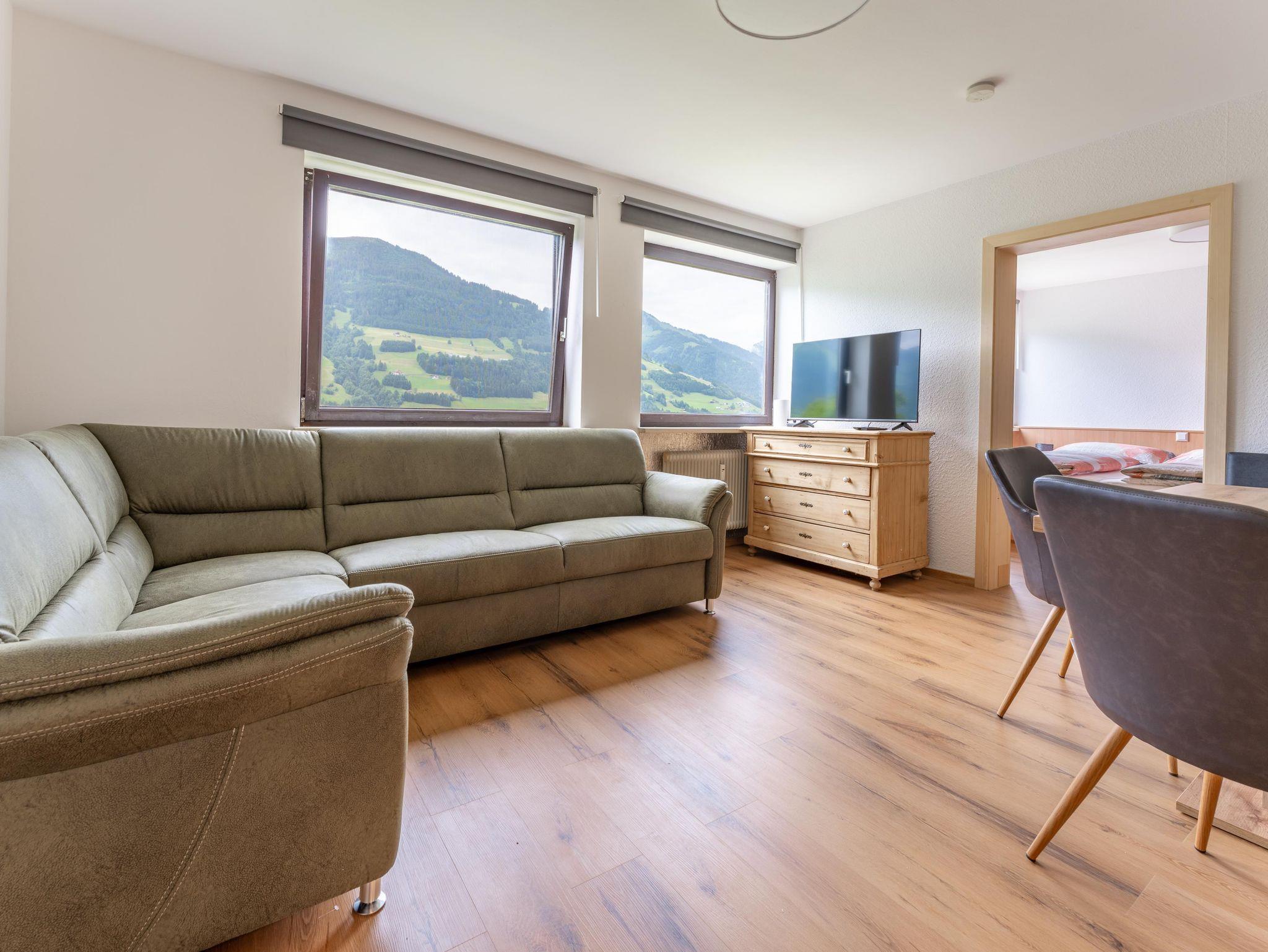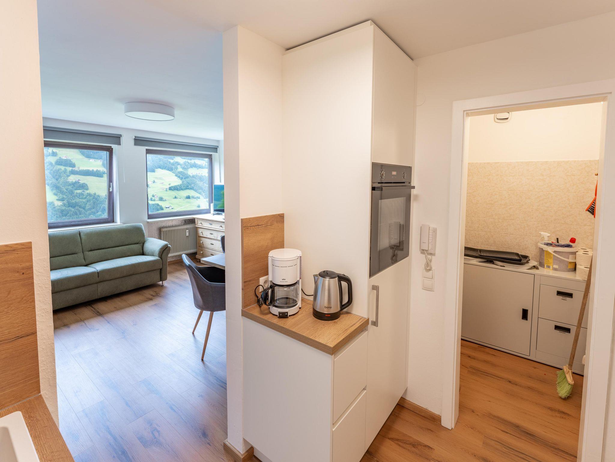 Beim Betreten des Apartments gelangt man in die voll ausgestattete Küche mit Filterkaffeemaschine, Wasserkocher, Kontaktgrill, Backofen, Kühlschrank und Geschirrspüler. Geschirr, Besteck und Gläser sind für jede Gelegenheit vorhanden. Neben der Küche befindet sich ein praktischer Hauswirtschaftsraum – ideal für Mülltrennung und zusätzlichen Stauraum. Der großzügige Wohnbereich lädt mit gemütlicher Couchecke und Fernseher zum Verweilen ein. Der angrenzende Esstisch bietet Platz für gemeinsame Mahlzeiten oder Spieleabende. Das geräumige Schlafzimmer ist ideal für Familien und mit Doppelbett, Etagenbett und viel Stauraum ausgestattet – perfekt, um nach einem aktiven Tag zur Ruhe zu kommen. Das minimalistische Bad bietet alles, was man braucht: Waschbecken, Dusche und WC. Das Apartment hat keinen eigenen Balkon, über das Treppenhaus ist jedoch ein Balkon mit Aussicht nutzbar. Es liegt zentral im Ortskern mit allen wichtigen Einrichtungen in unmittelbarer Nähe.