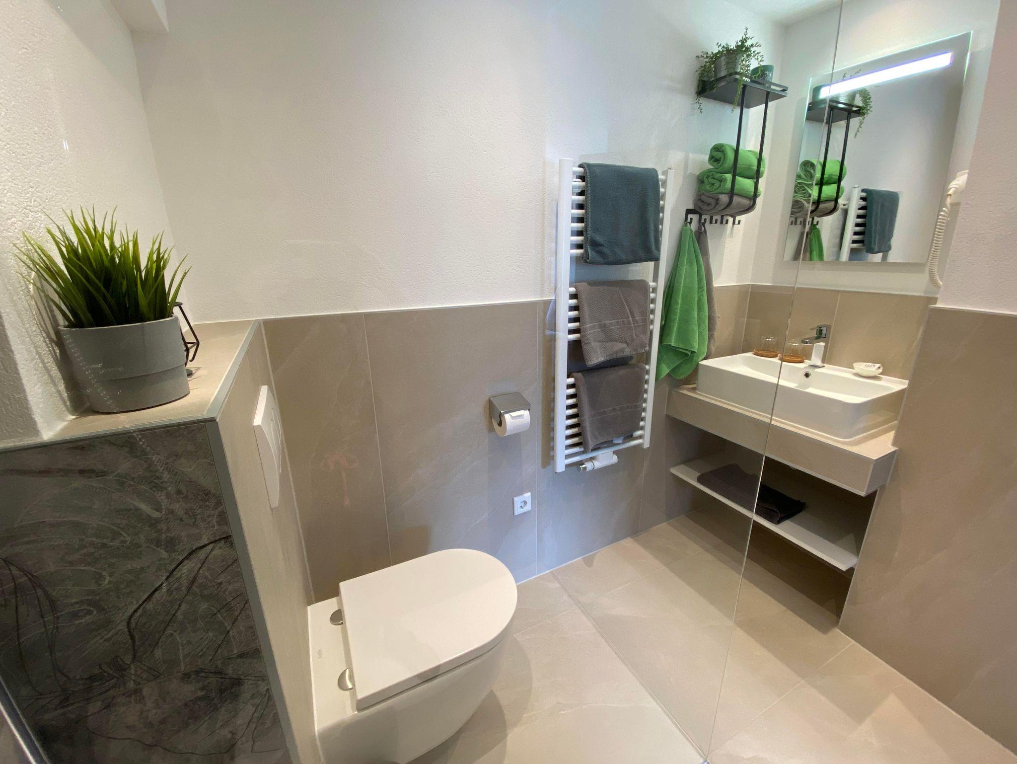 Ferienwohnung für 2-6 Personen, 2 Schlafzimmer jeweils mit Dusche/WC, 1 Wohnschlafraum mit Sat-TV, Radio, gemütliche Essecke, großer nord-, und südseitiger Balkon.