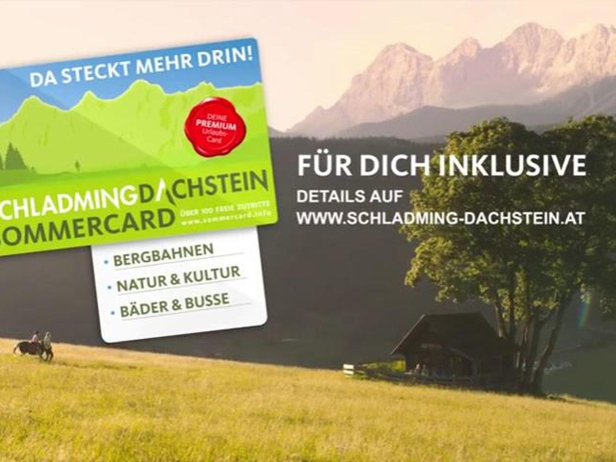 Der optimale Ausgangspunkt für Ihre Winteraktivitäten, denn die klassisch präparierte Langlaufloipe und die breiten Winterwanderwege führen direkt an unserem Haus vorbei. Mit der Schladming Dachstein Sommercard nutzen Sie eine große Auswahl an Freizeitattraktionen in der Region. Ein besonderes und spannendes Abenteuer für die ganze Familie wartet am Sattelberg. Österreichs 1. Umwelterlebnispfad für Kinder. In nur 5 Gehminuten kommen Sie zum Einstieg an der Sattelberghütte. Die Haltestelle zum kostenlosen Ski- und Wanderbus erreichen Sie zu Fuß in nur 2 Minuten.